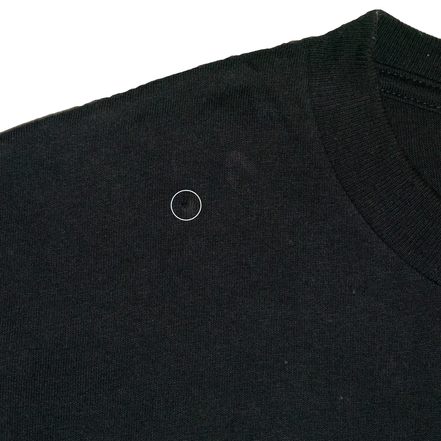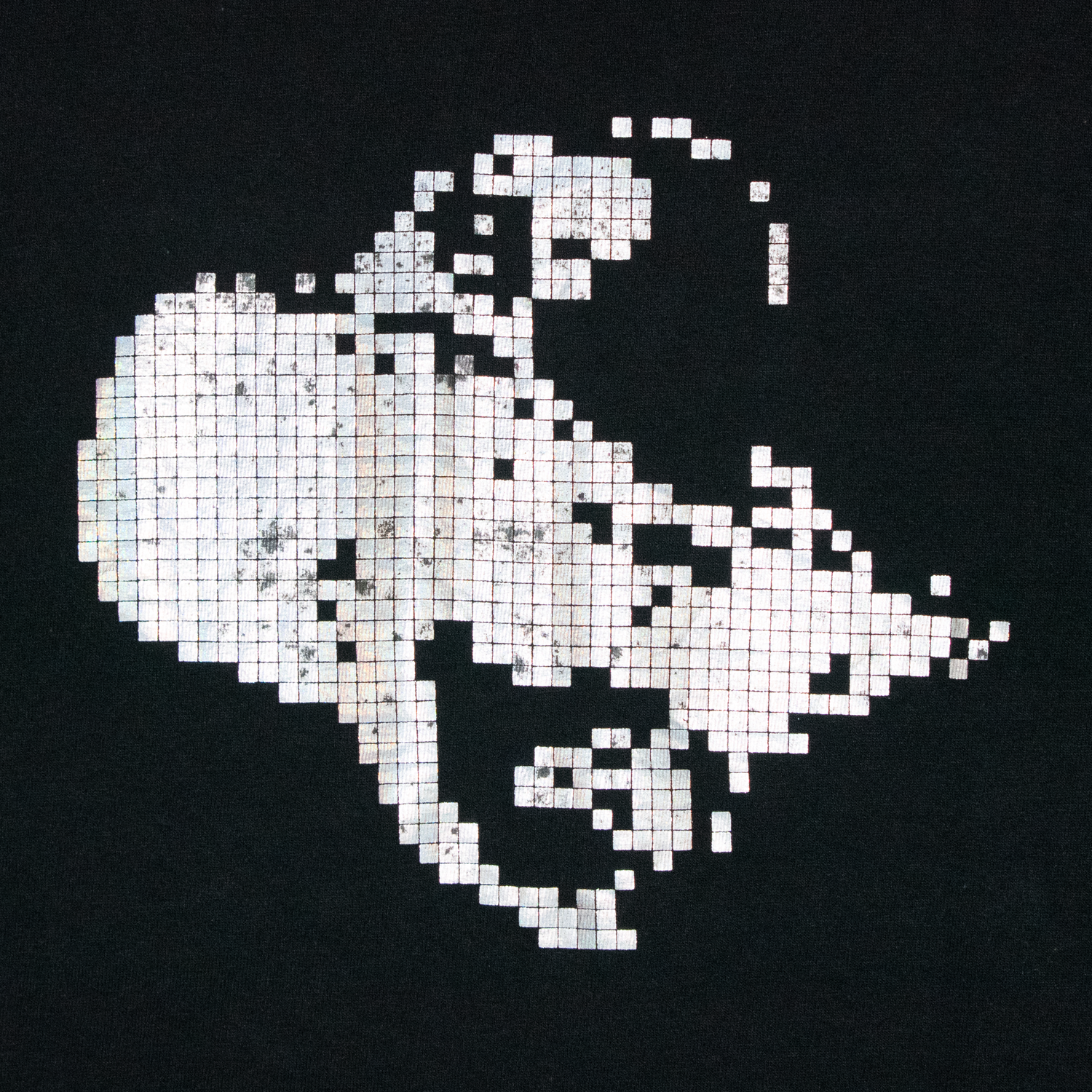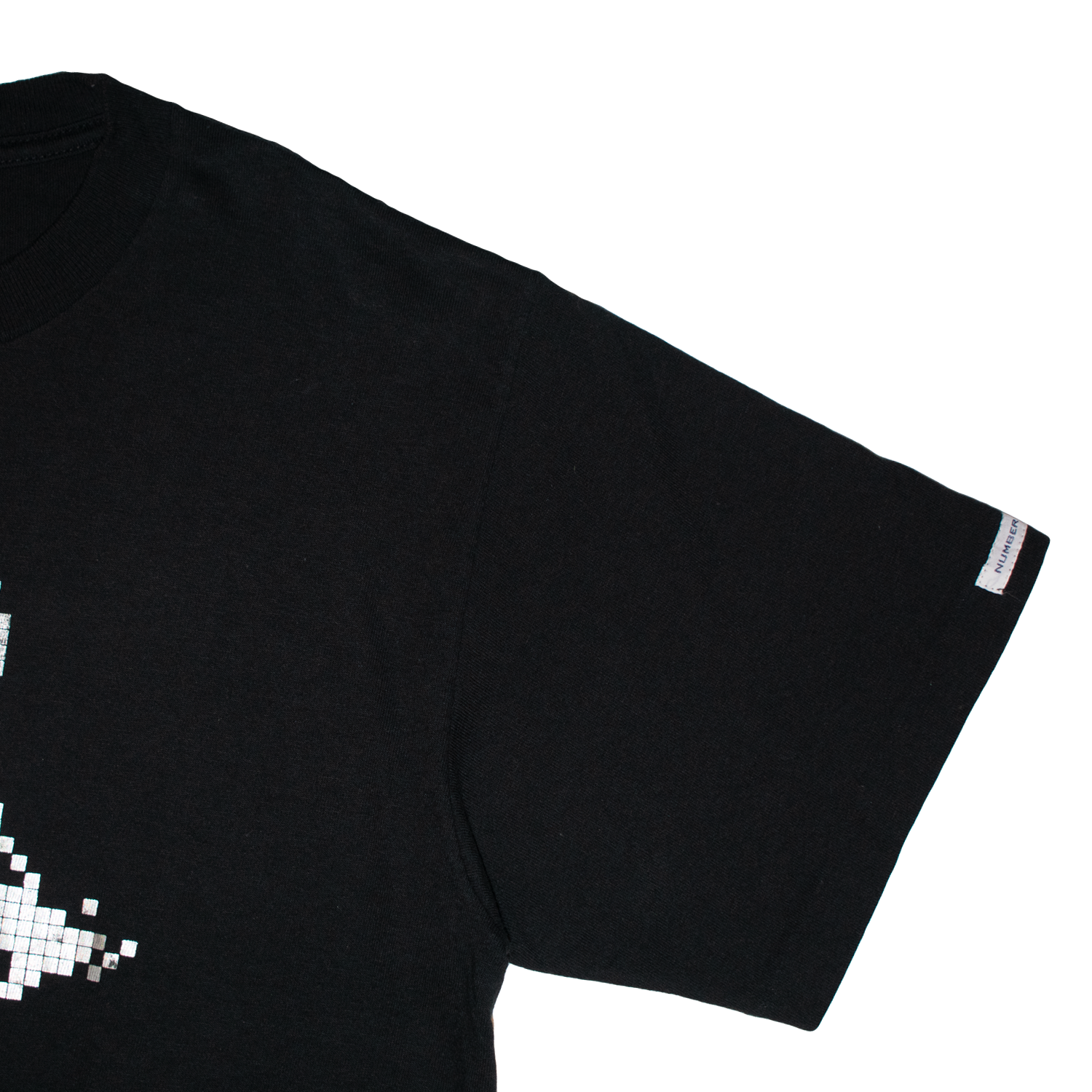 Here we have a rare t-shirt from Number (N)ine’s Fall/Winter 1999 “Rock” collection. This piece features a unique digi-cowboy graphic screen-print with a foil-like color that makes the image really pop. What makes this graphic so interesting is its two-way ambigram-like properties – If you flip the graphic upside-down, some say you can see a silhouette of a man wearing a cowboy hat in a nodding motion. This is a reference to a popular 1964 interview with Paul McCartney and The Beatles on a local Dallas, TX news channel. While this is totally speculative, the reference pic is on my story so let me know what you think!