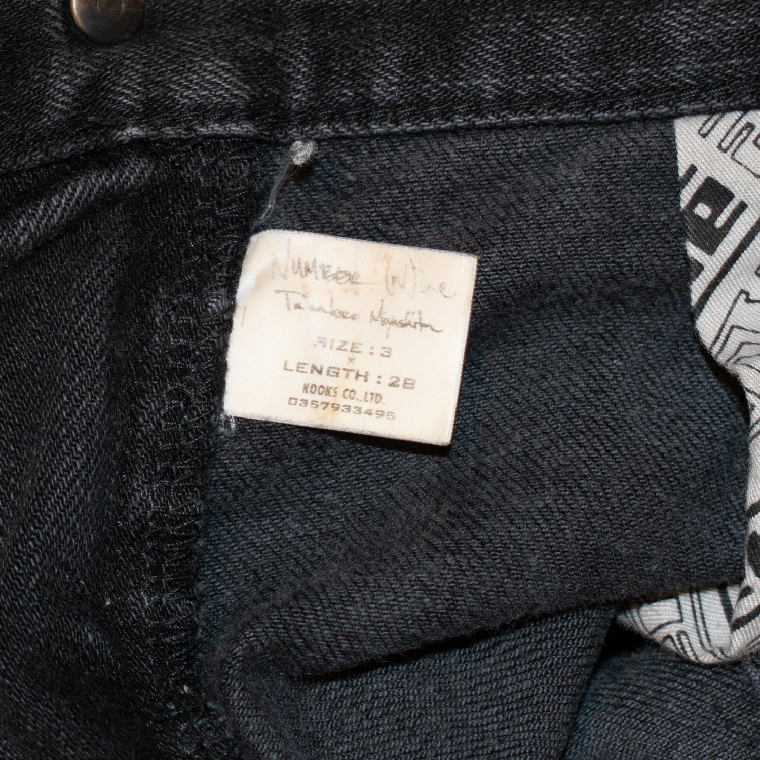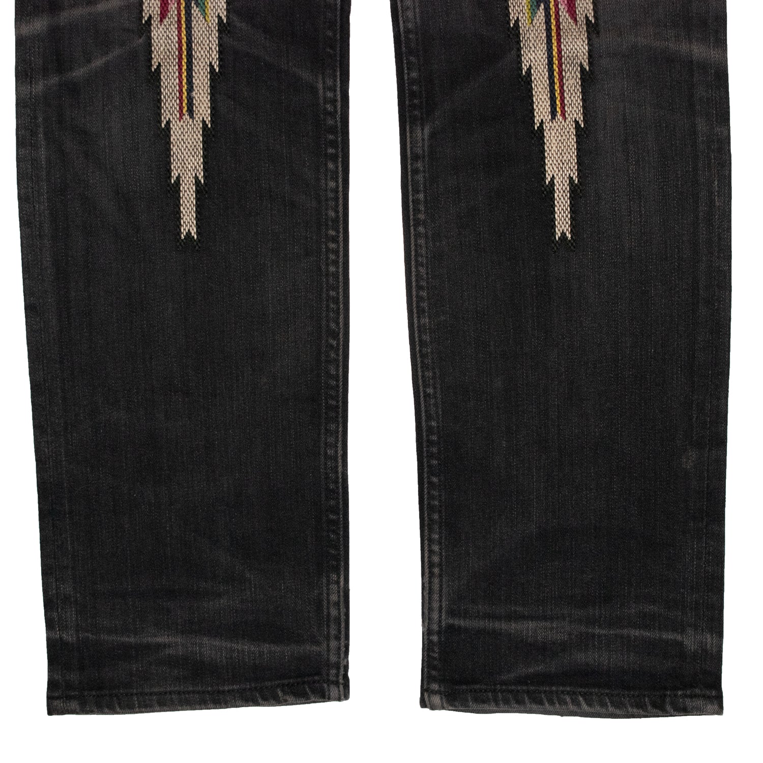 Here we have an iconic pair of jeans from Number (N)ine. This faded black skinny-fit denim features the highly recognizable Ortega motif finely woven onto the knees and back pockets. Equipped with a Riri zipper fly, PAIN tag, and Number (N)ine’s crying heart leather patch, this garment is a timeless piece from one of Takahiro Miyashita’s best collections.