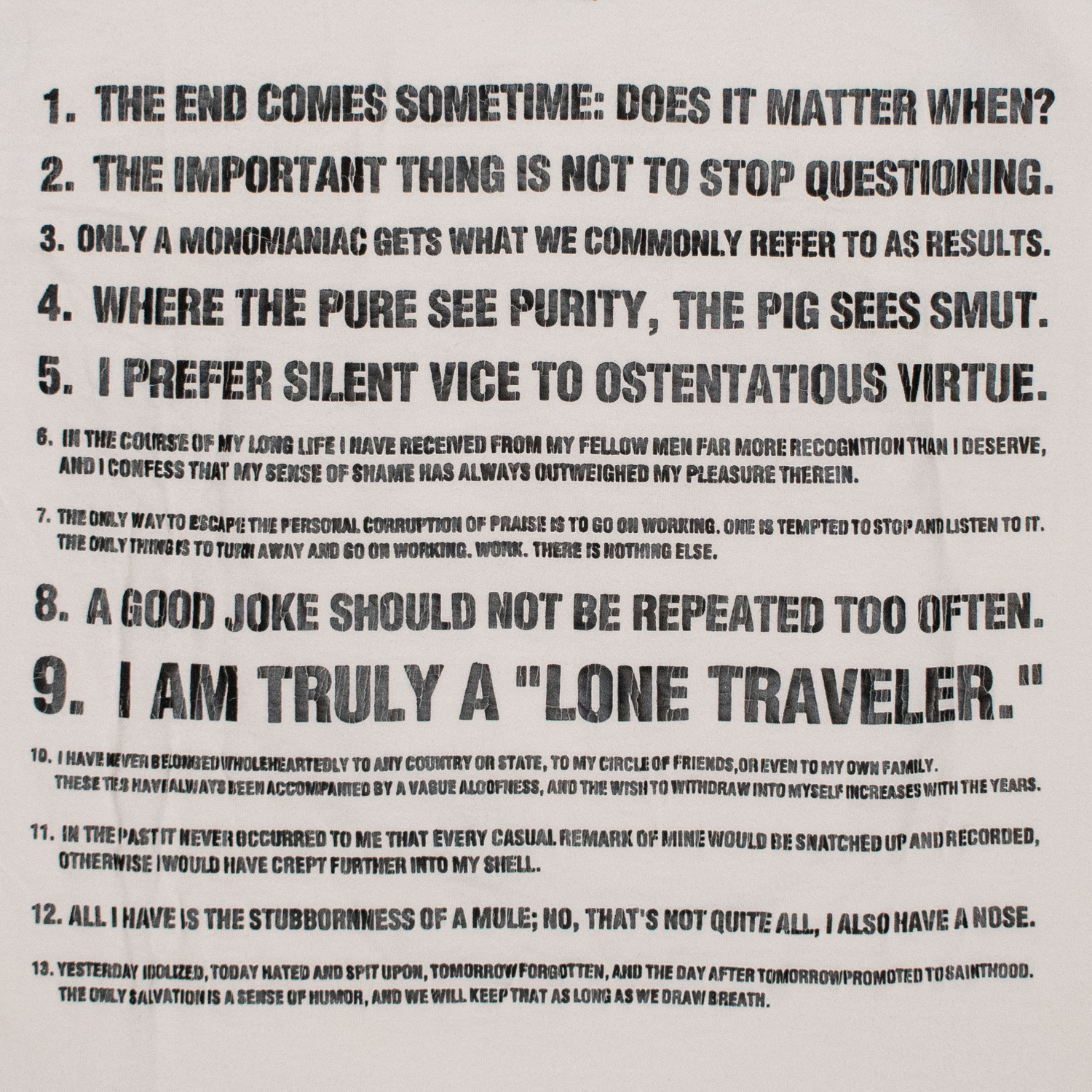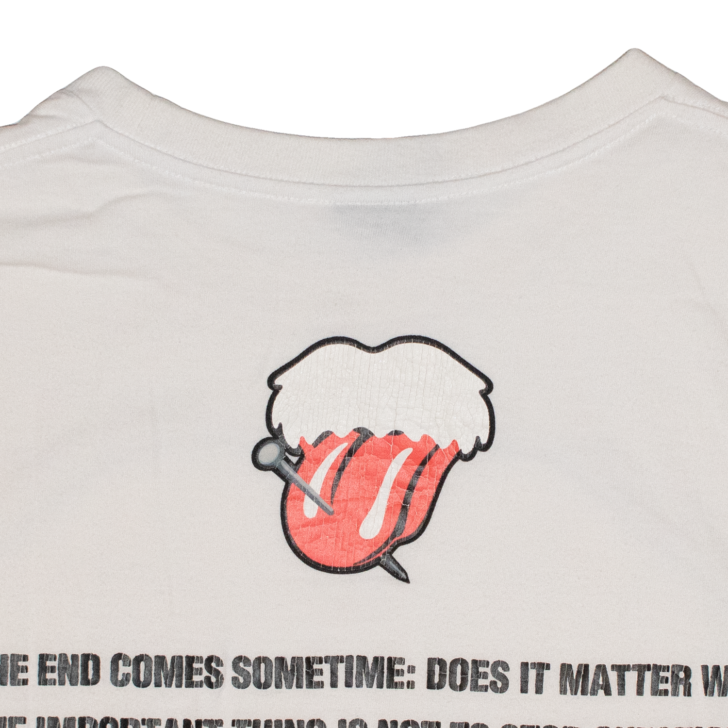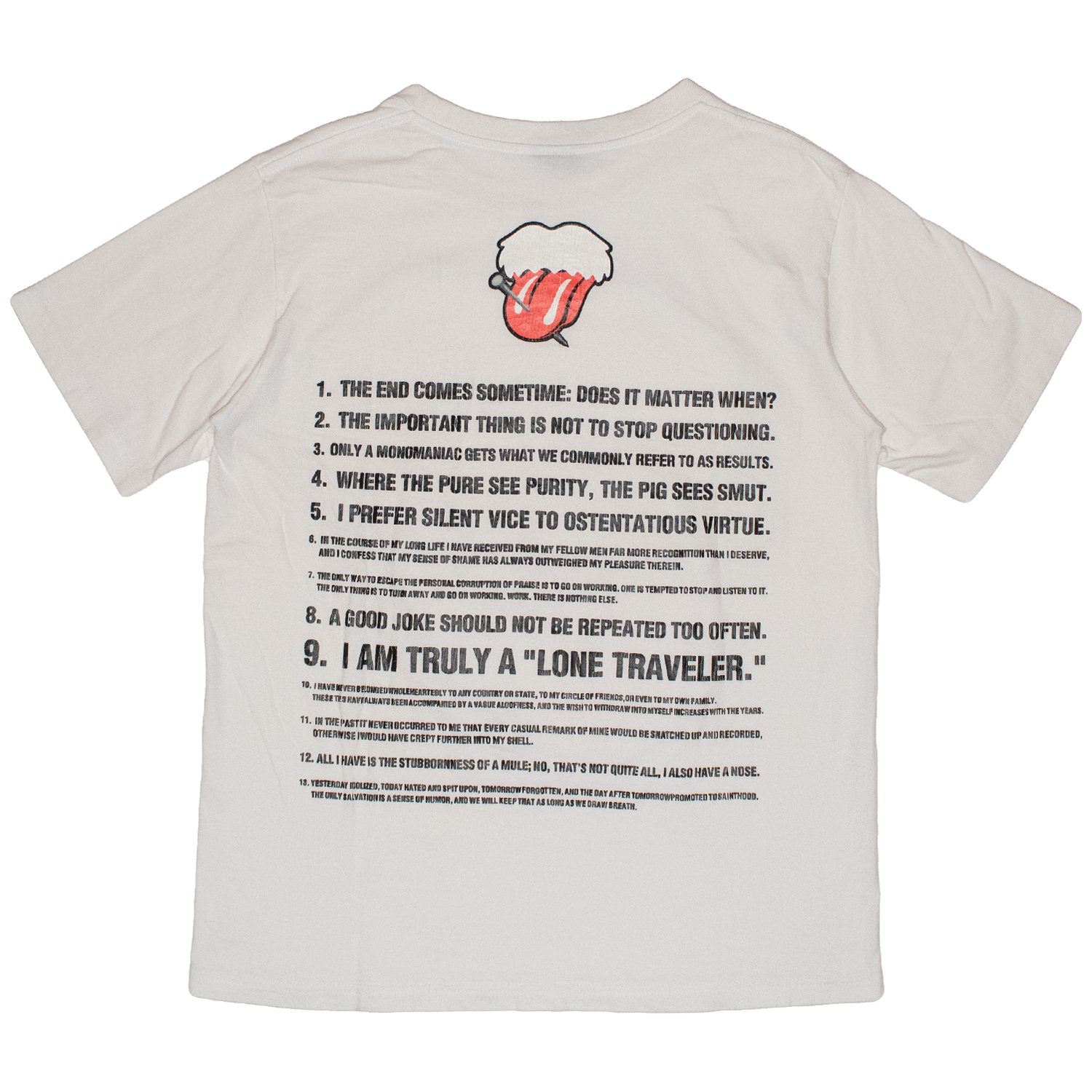 Here we have a reissue tee from Number (N)ine’s SS/AW 2003 “Touch Me Im Sick” collection. This piece features Takahiro Miyashita’s take on the iconic Rolling Stones tongue logo printed on the front and a series of quotes by Albert Einstein on the back. This high-quality 100% cotton tee uses a unique screen-printing technique that allows the print to crack and deteriorate over time.