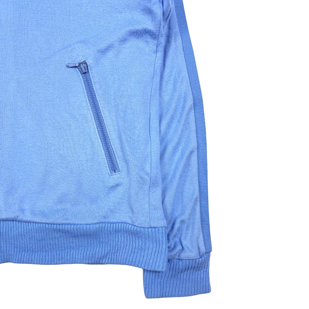 This track jacket from Number (N)ine’s Autumn/Winter 2003 “Touch Me I’m Sick” collection features Takahiro Miyashita’s reinterpretation of the classic Rolling Stones logo, complete with an Einstein-esque mustache and a nail pierced through the tongue graphic on the chest. Made in Japan from 100% acrylic, it comes in a baby blue colorway with white striped piping running down both sleeves.