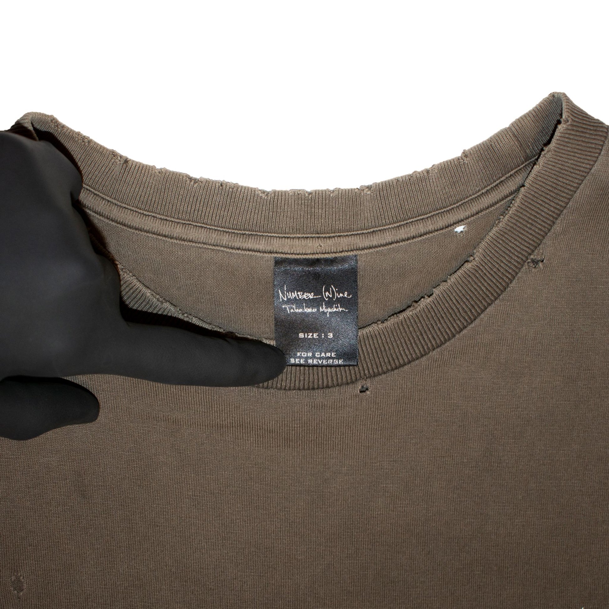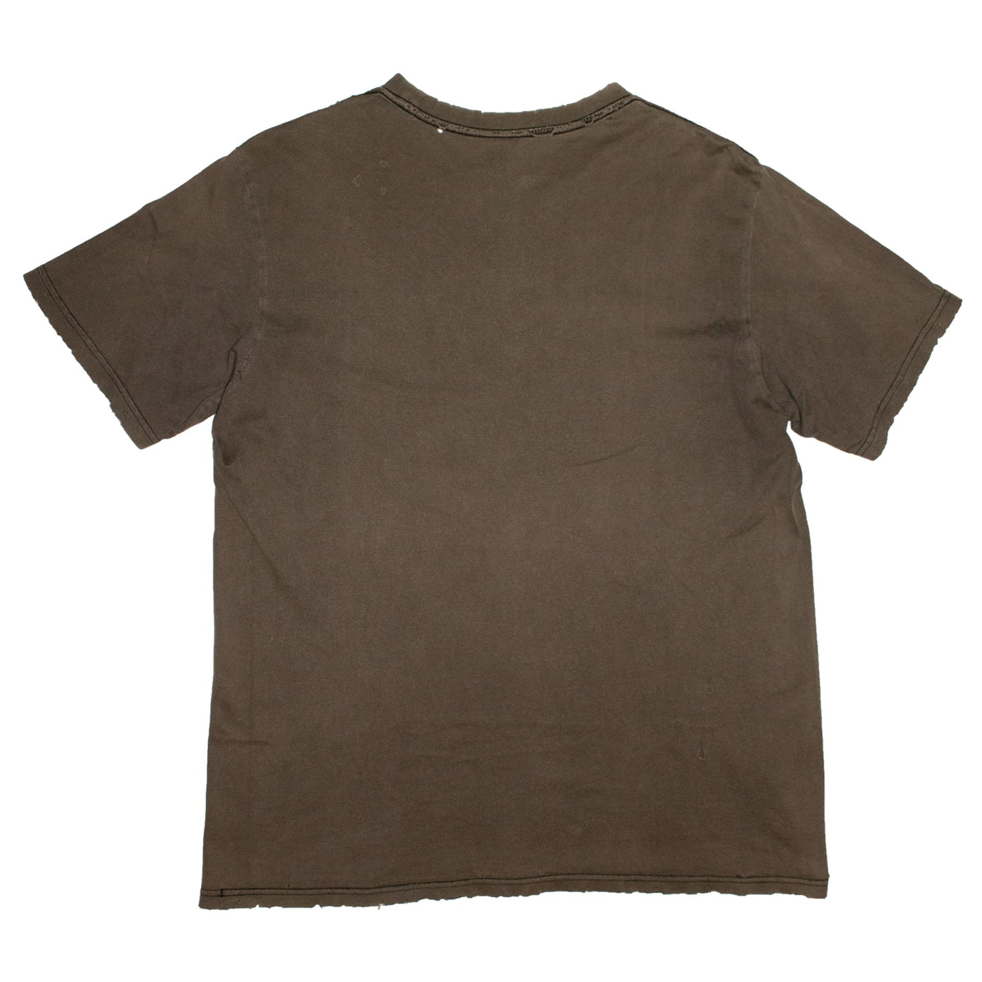 Here we have a tee from Number (N)ine’s SS05 collection “Nightcrawler.” This tee features a smashed double-neck guitar motif and distressing throughout the garment. The graphic has aged well and fits the elements of distressing on this piece perfectly.