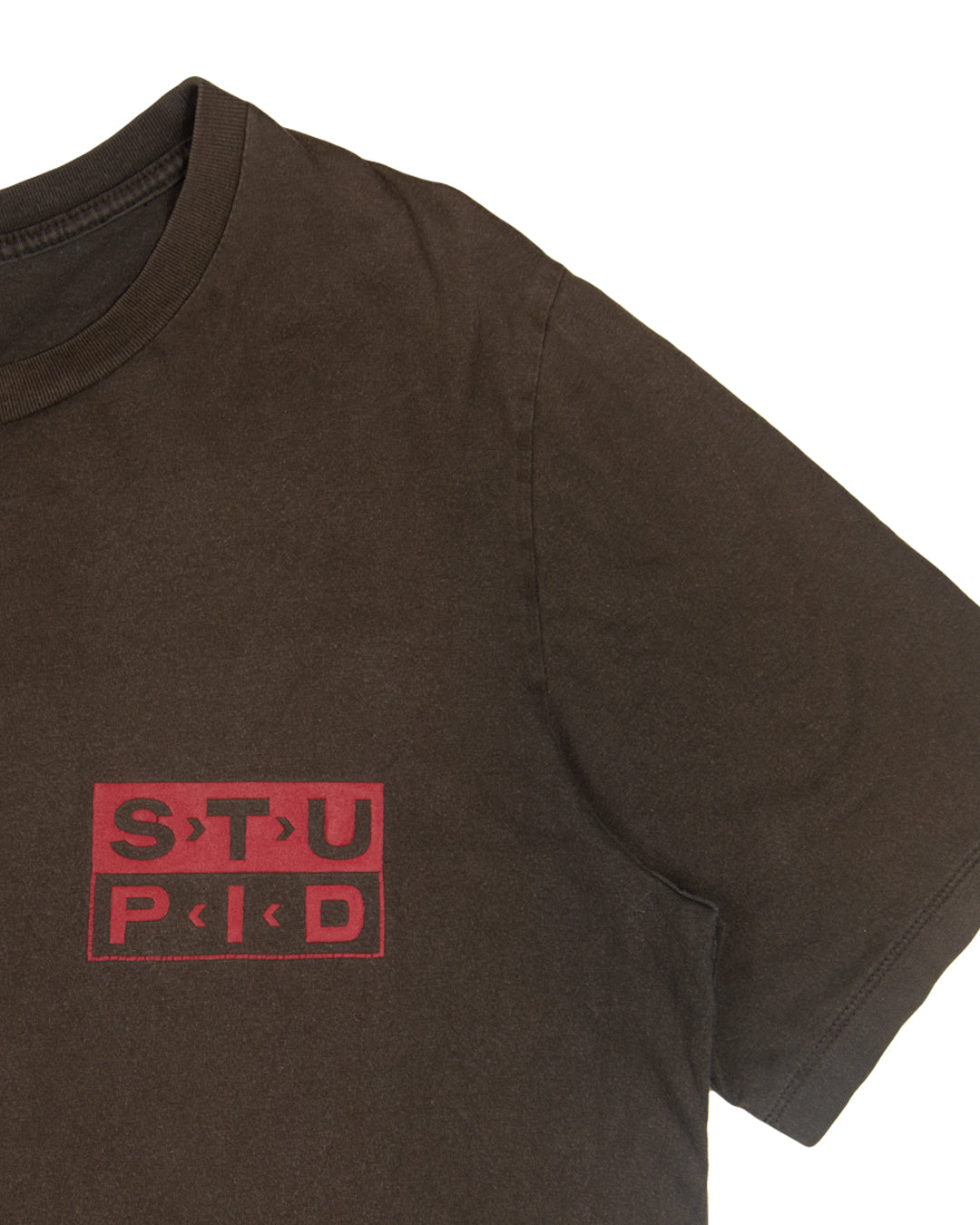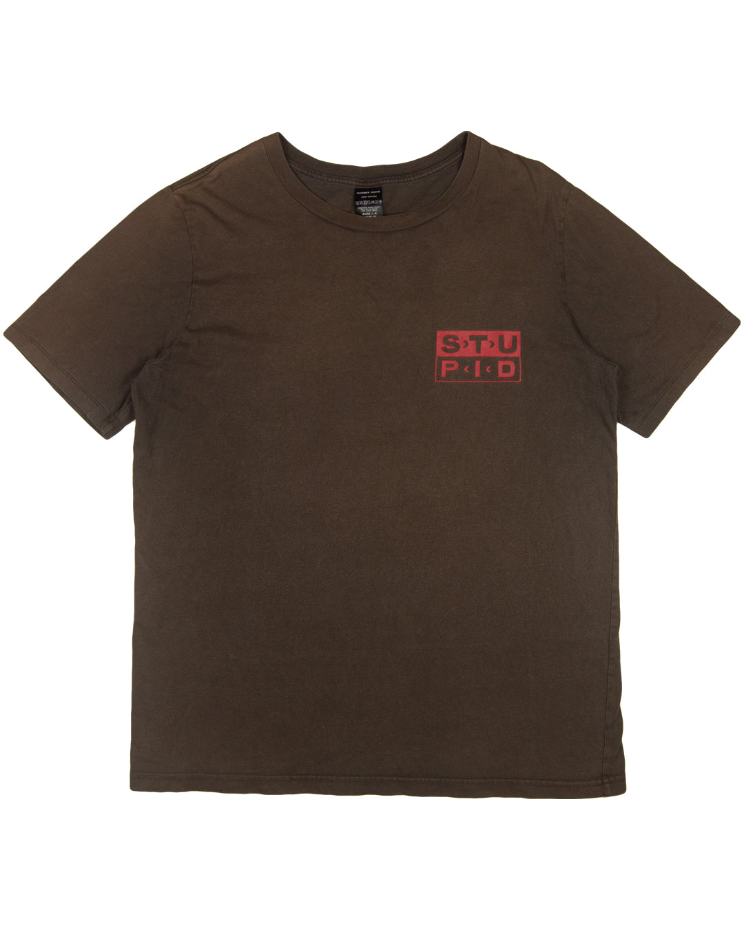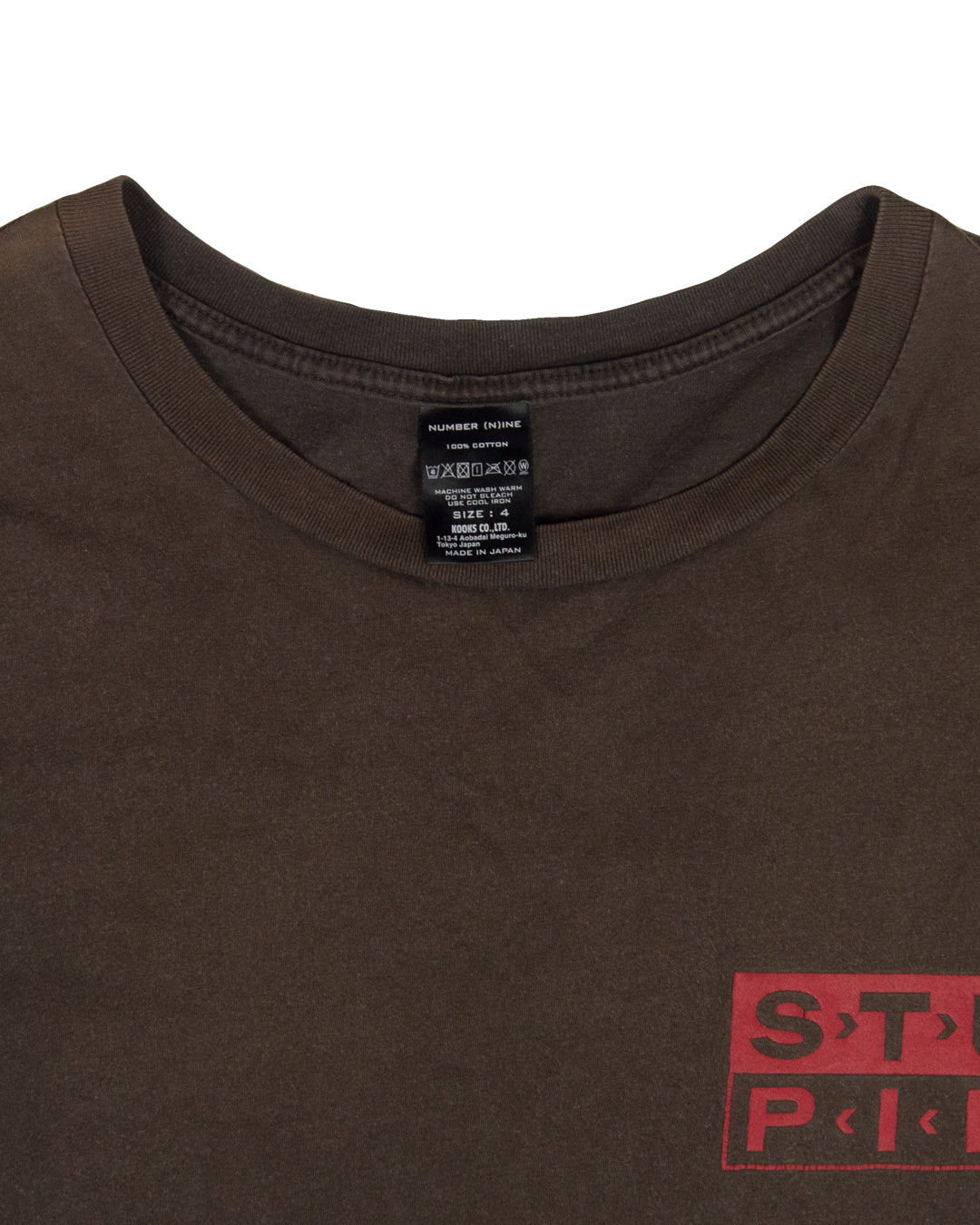 Here we have a unique t-shirt from the cult Japanese label Number (N)ine. This piece features a bold “YOU KNOW YOU’RE NOT RIGHT” screen-print placed directly on the back of a faded brown garment. The front of the tee also includes a “STU-PID” graphic screen-printed on the left chest which is inspired by the iconic record label Sub Pop – the original home of Nirvana, Soundgarden, and Mudhoney, central players in the grunge movement.