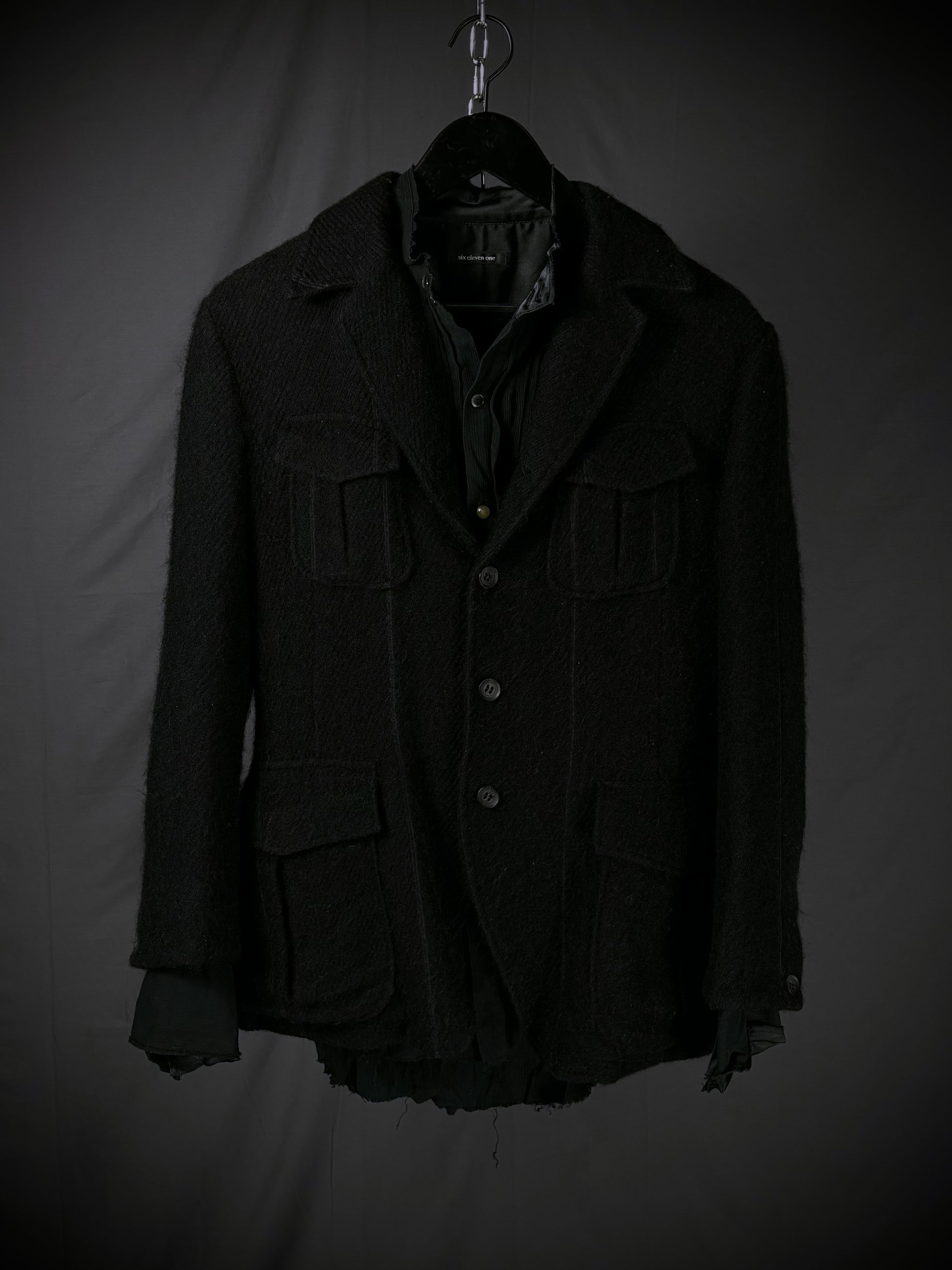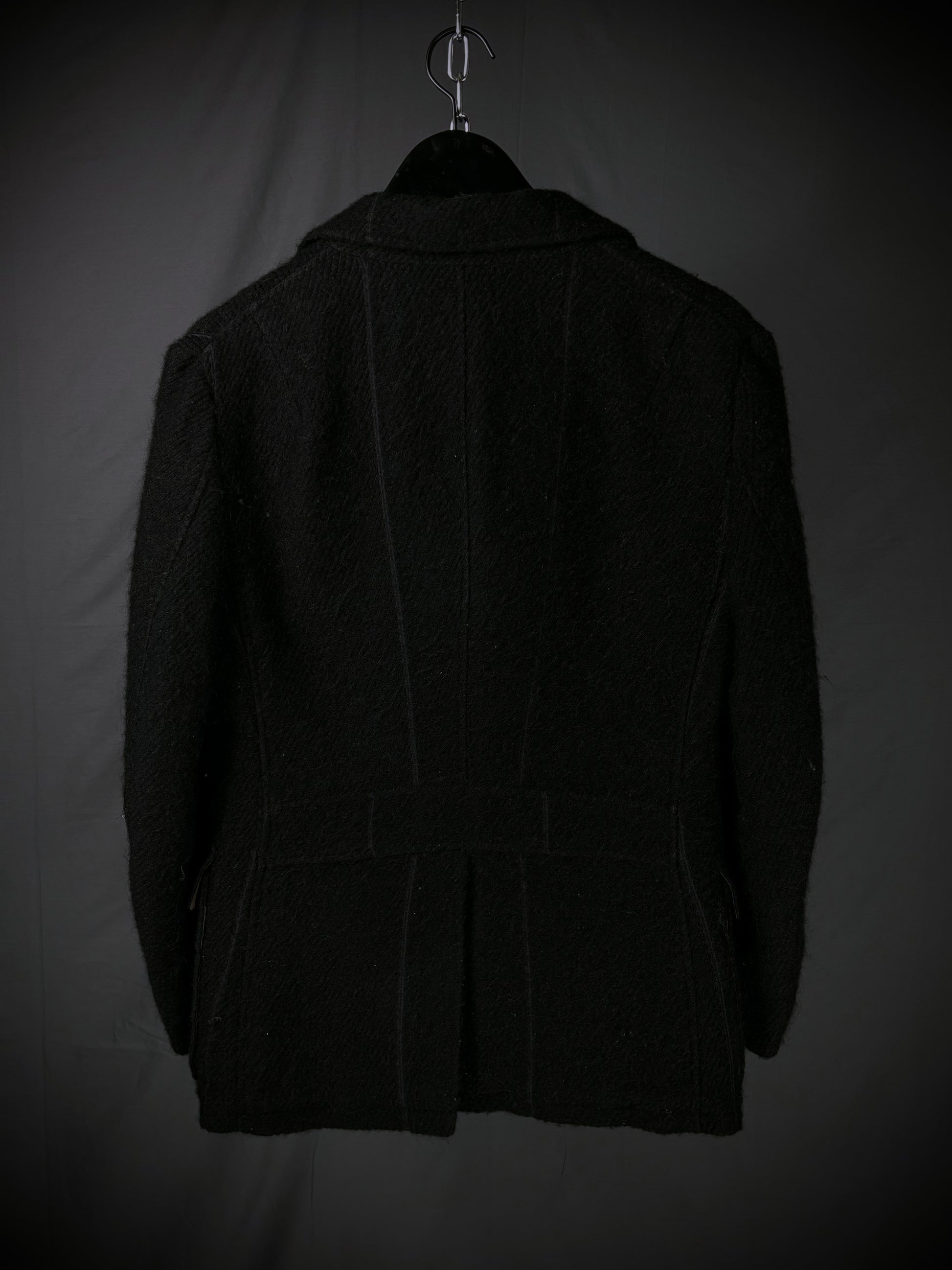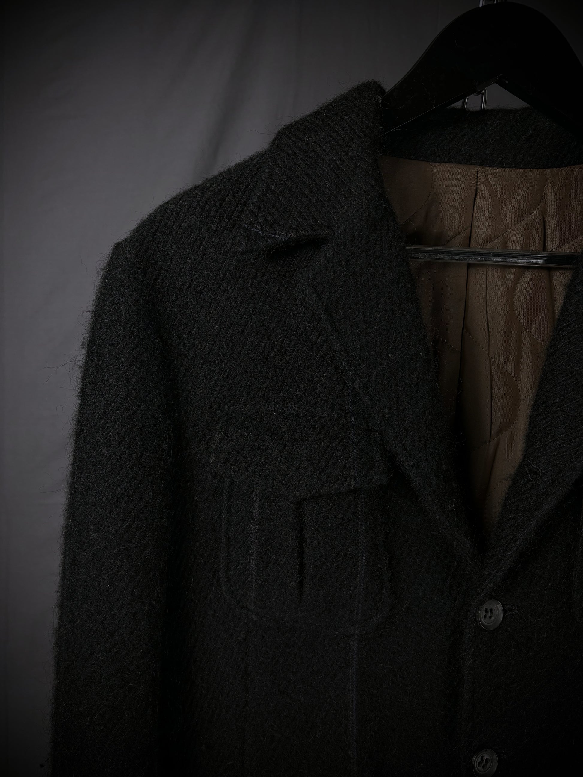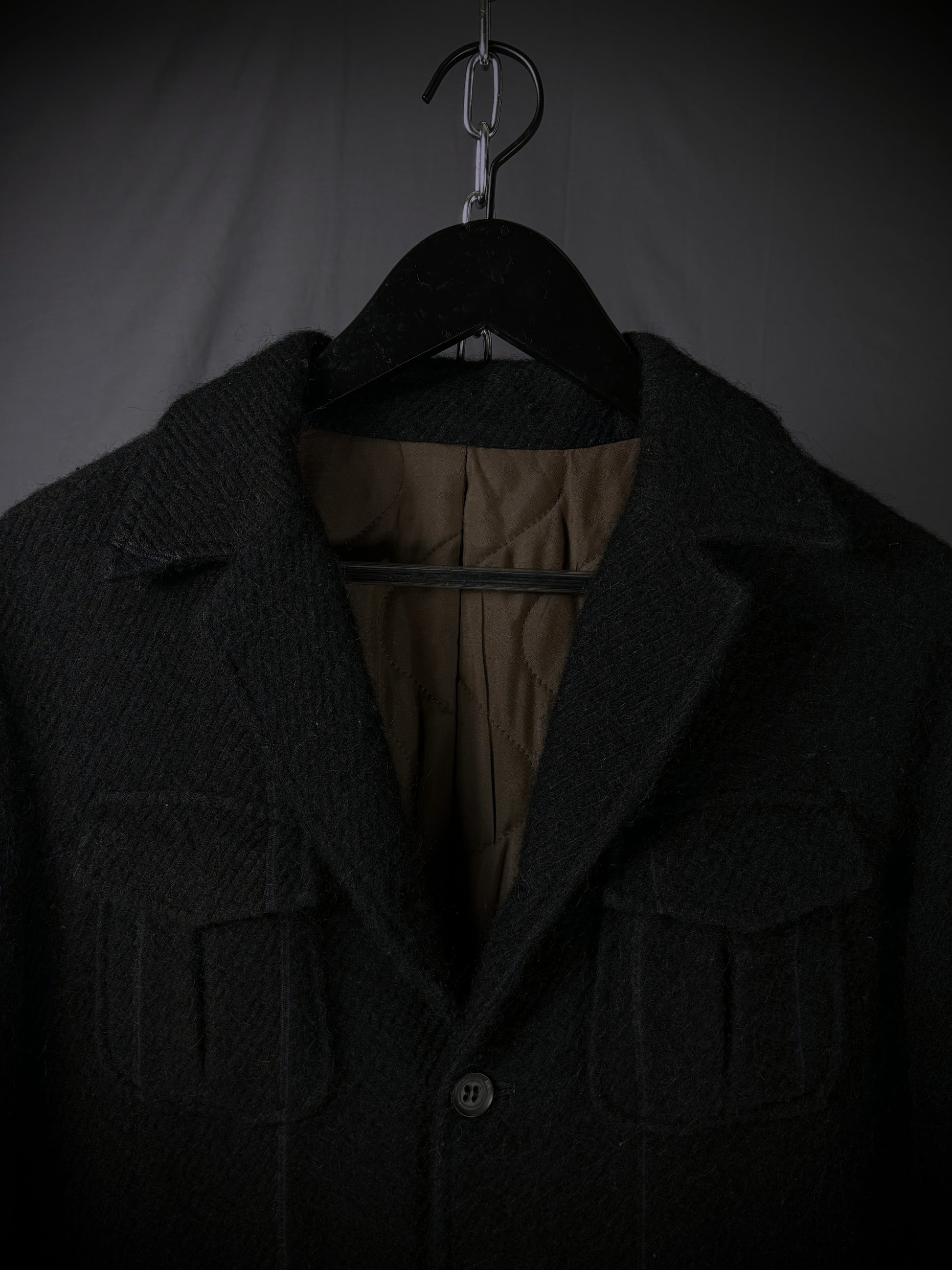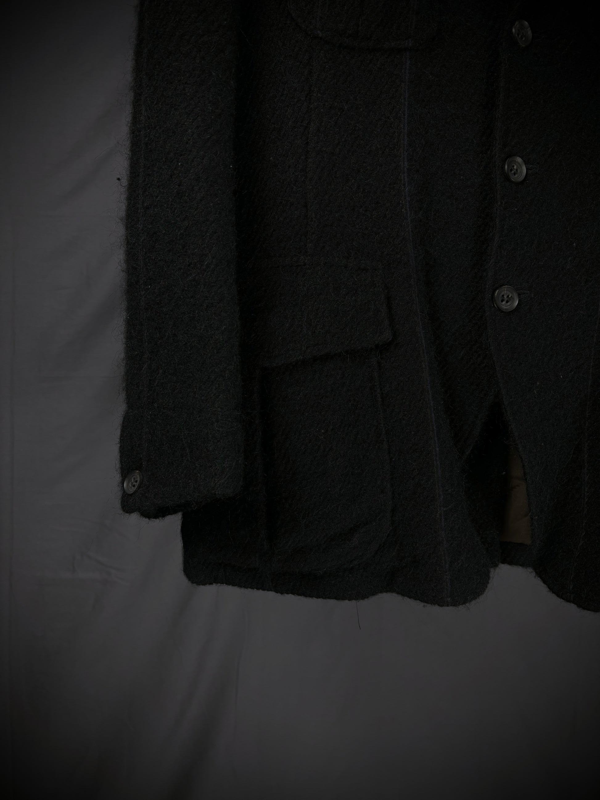 Designed by Junichi Abe—a Bunka Fashion College graduate and founding member of Junya Watanabe, Comme des Garçons—this piece originates from PPCM, the collaborative label Abe co-founded before launching his acclaimed brand, Kolor, in 2004. Blending a sophisticated silhouette with a rugged, utilitarian edge, the jacket is crafted from a mohair, wool, cupro, and nylon blend that provides a soft, shaggy handfeel and a medium weight. It features a four-button closure, four utility pockets, and subtle pinstripe detailing throughout the weave. The interior is fully lined with quilted rayon-polyester, while the back is finished with structured paneling.