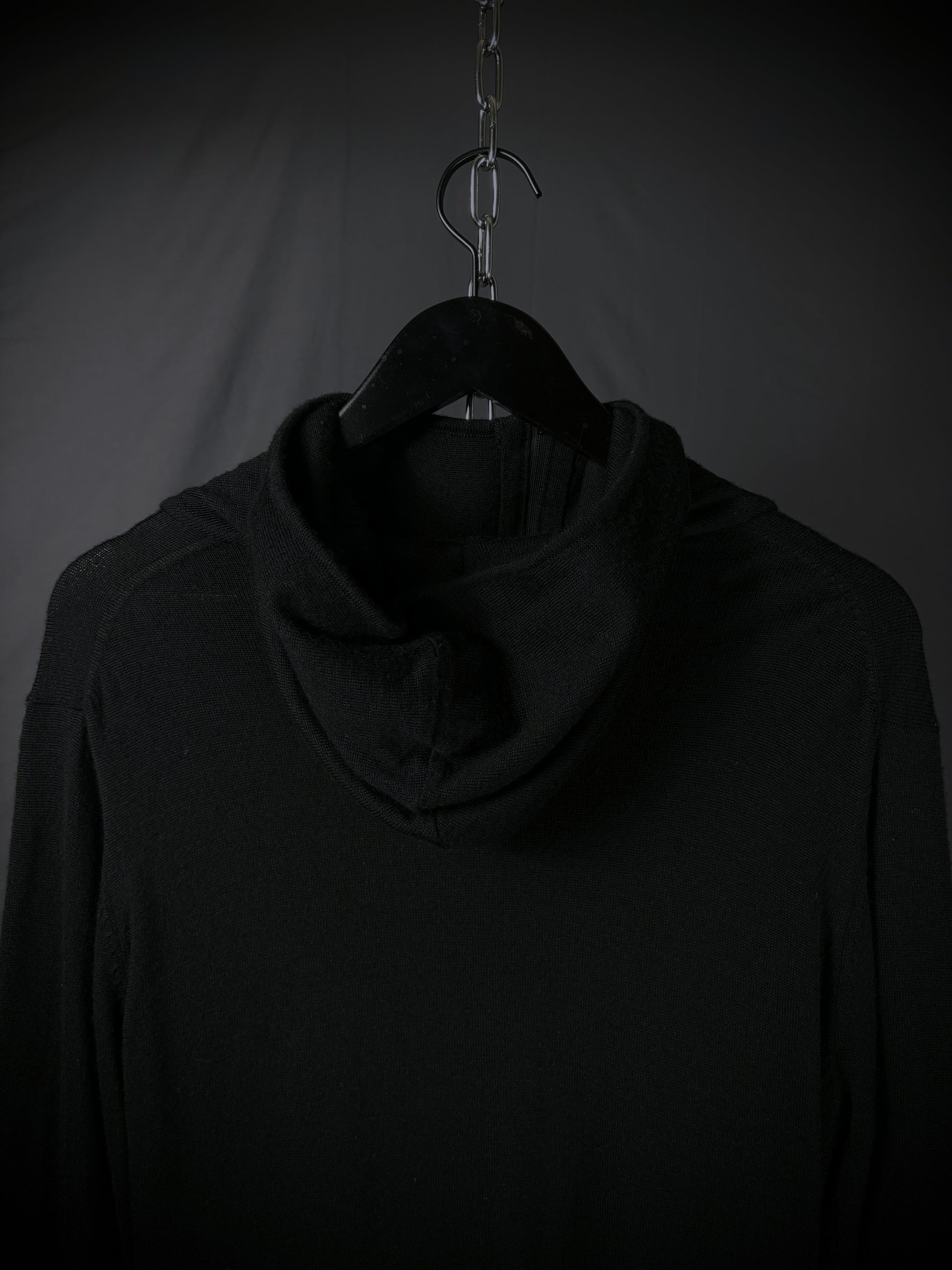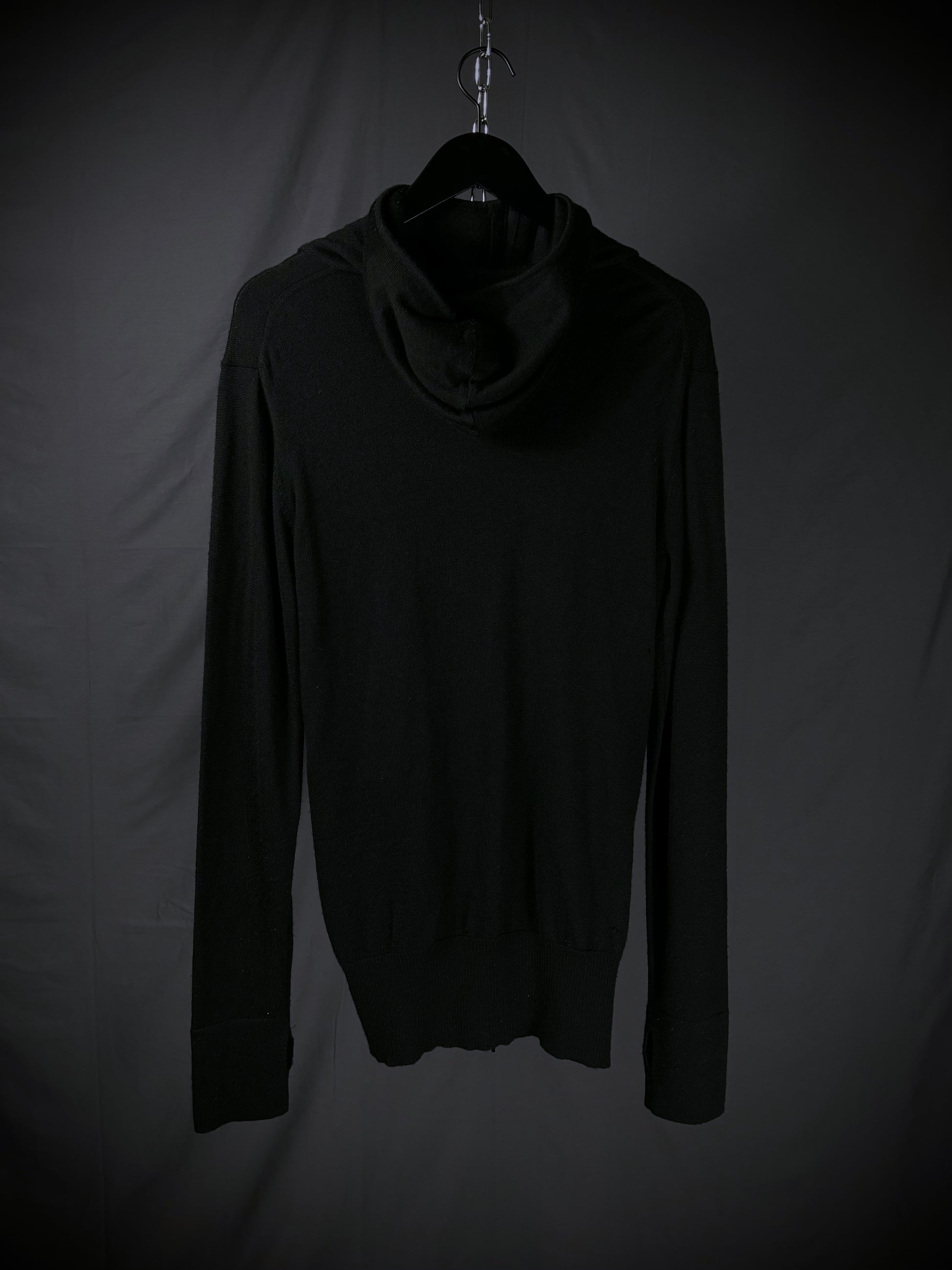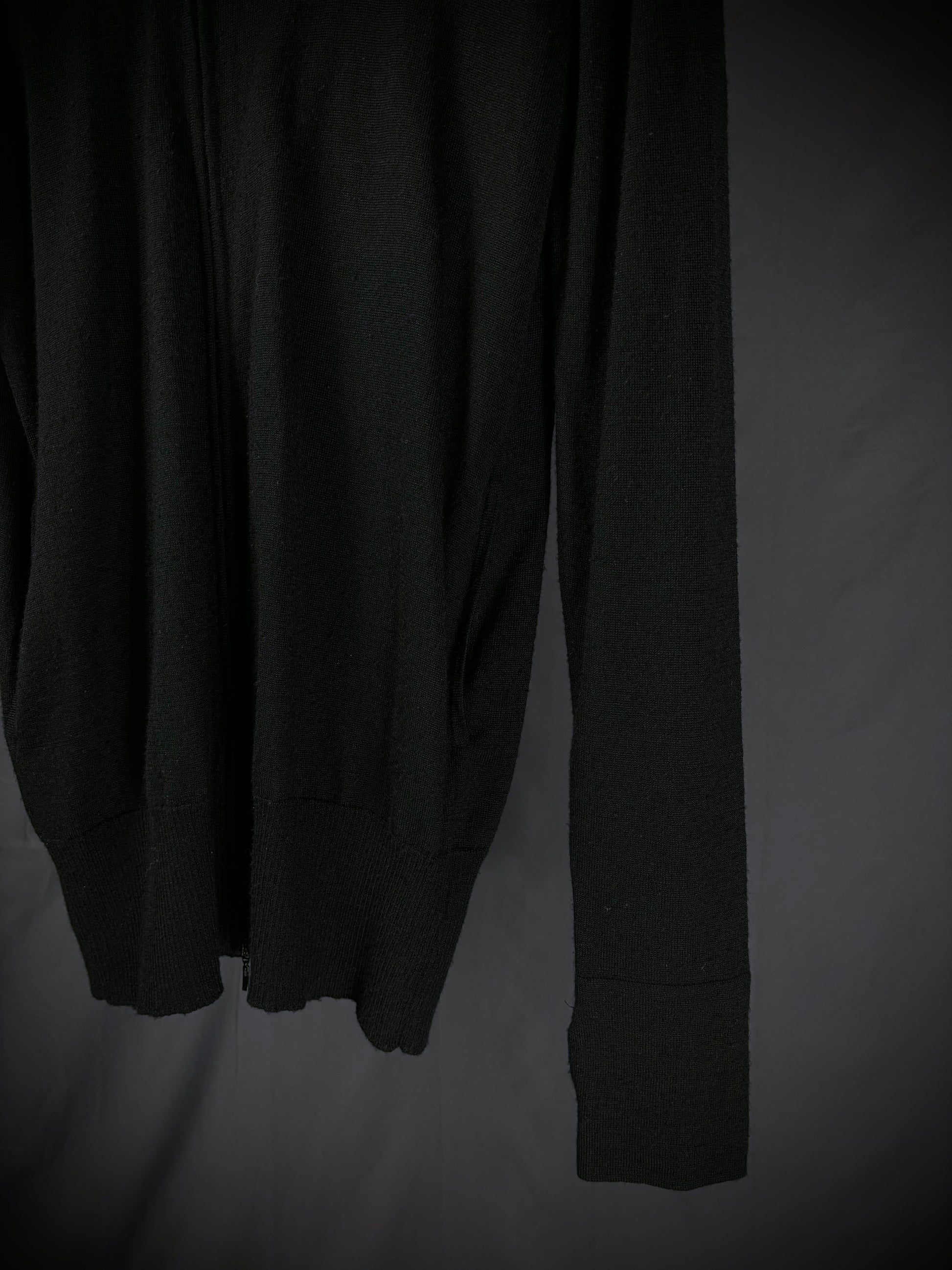 This zip-up hoodie by the Japanese brand PPFM from 2009 features a high-neck silhouette with a full zip closure. It includes thumb holes at the cuffs and ribbed detailing at the hem and cuffs. Made from a thin, soft acrylic–wool blend, it is suitable for year-round wear.
