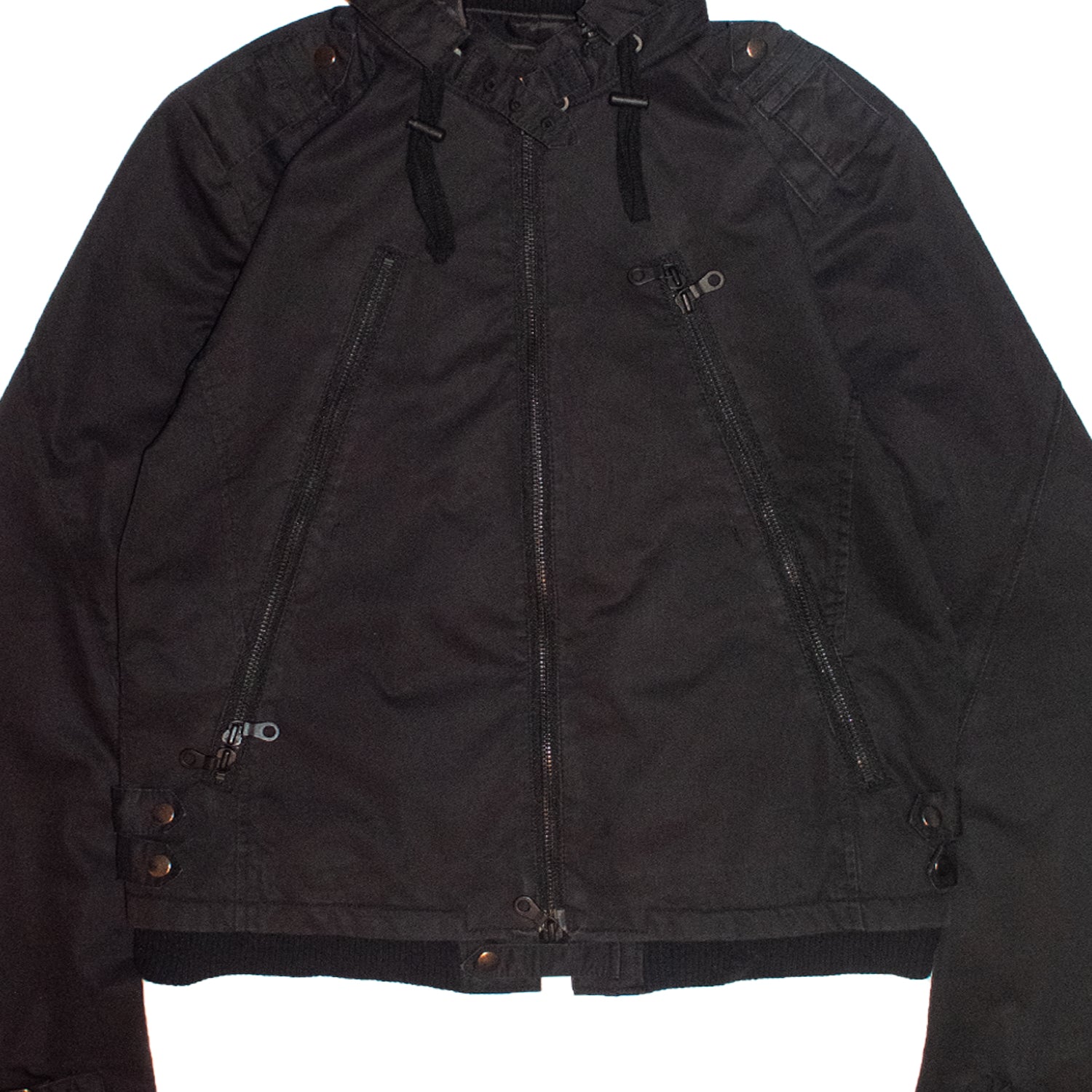 This jacket is constructed with nylon and features various details such as militaristic button straps, multiple zipper pockets, a removable hood, and a slim-fit design that’s slightly cropped.
