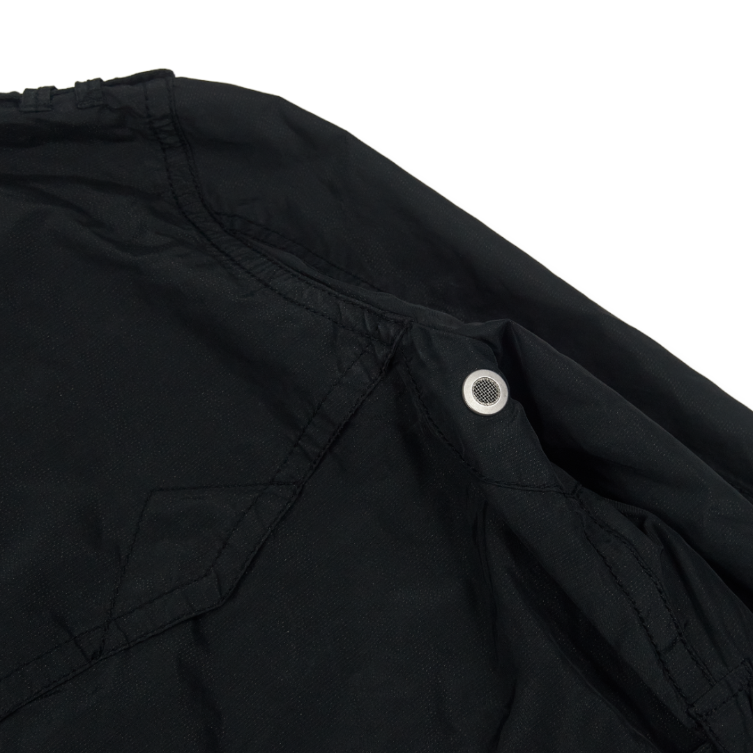 This nylon jacket by the Japanese brand PPFM from 2008 features an array of unique details such as its modular design consisting of a removable cotton track jacket-like “bib” with a hidden hood and military-esque graphic, a removable waist belt, buckled arm openings, and interior straps for added versatility.