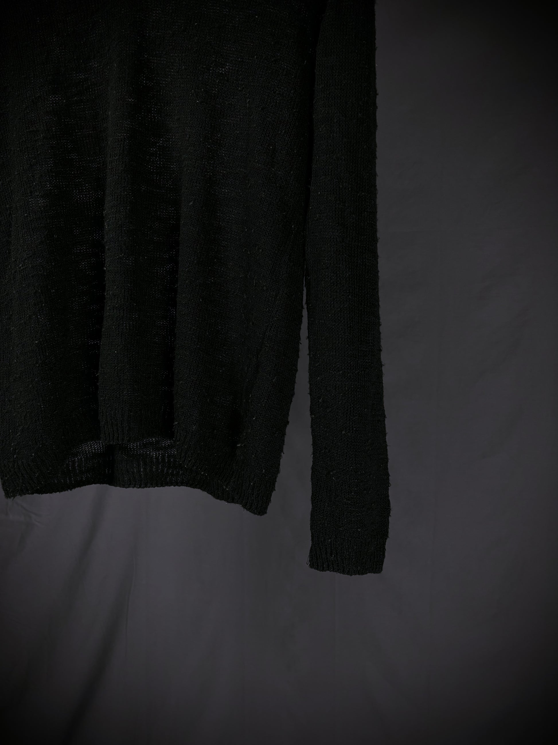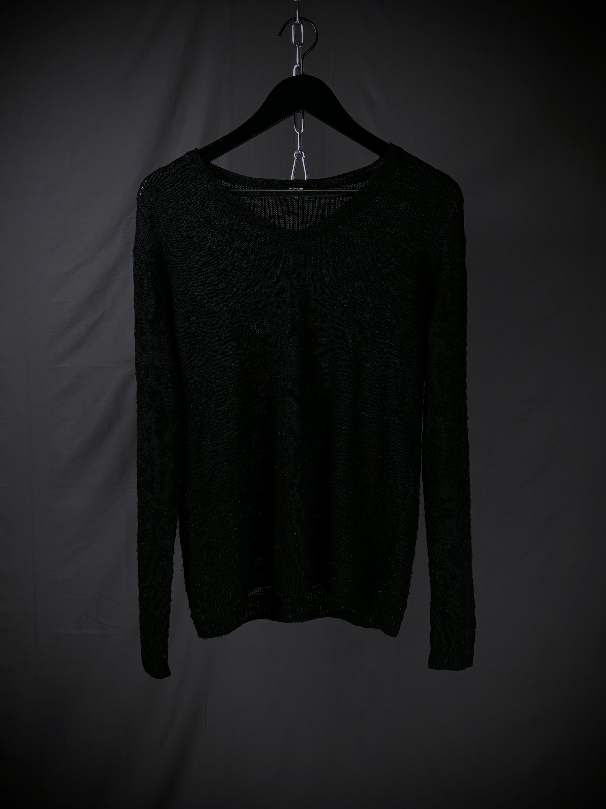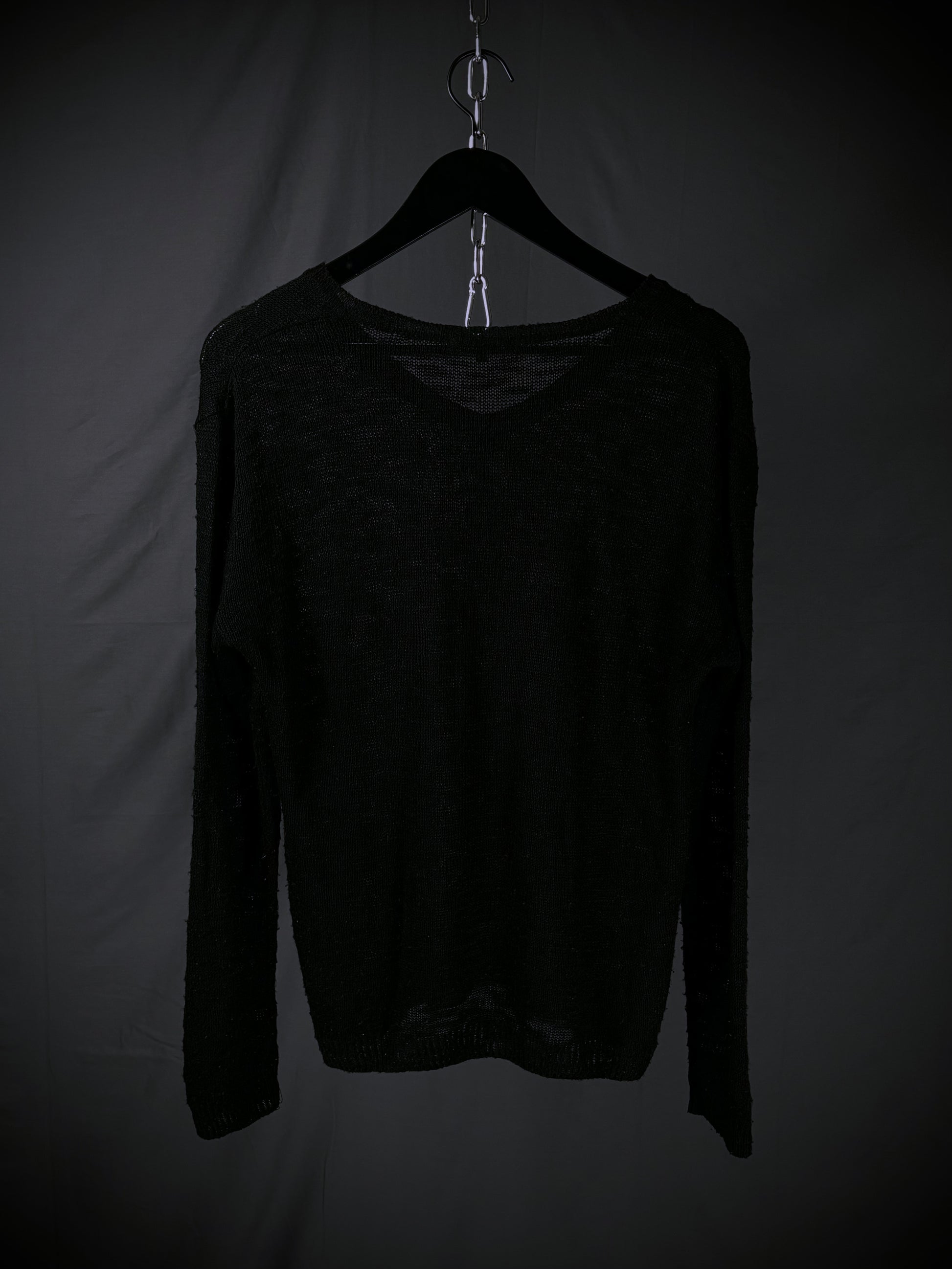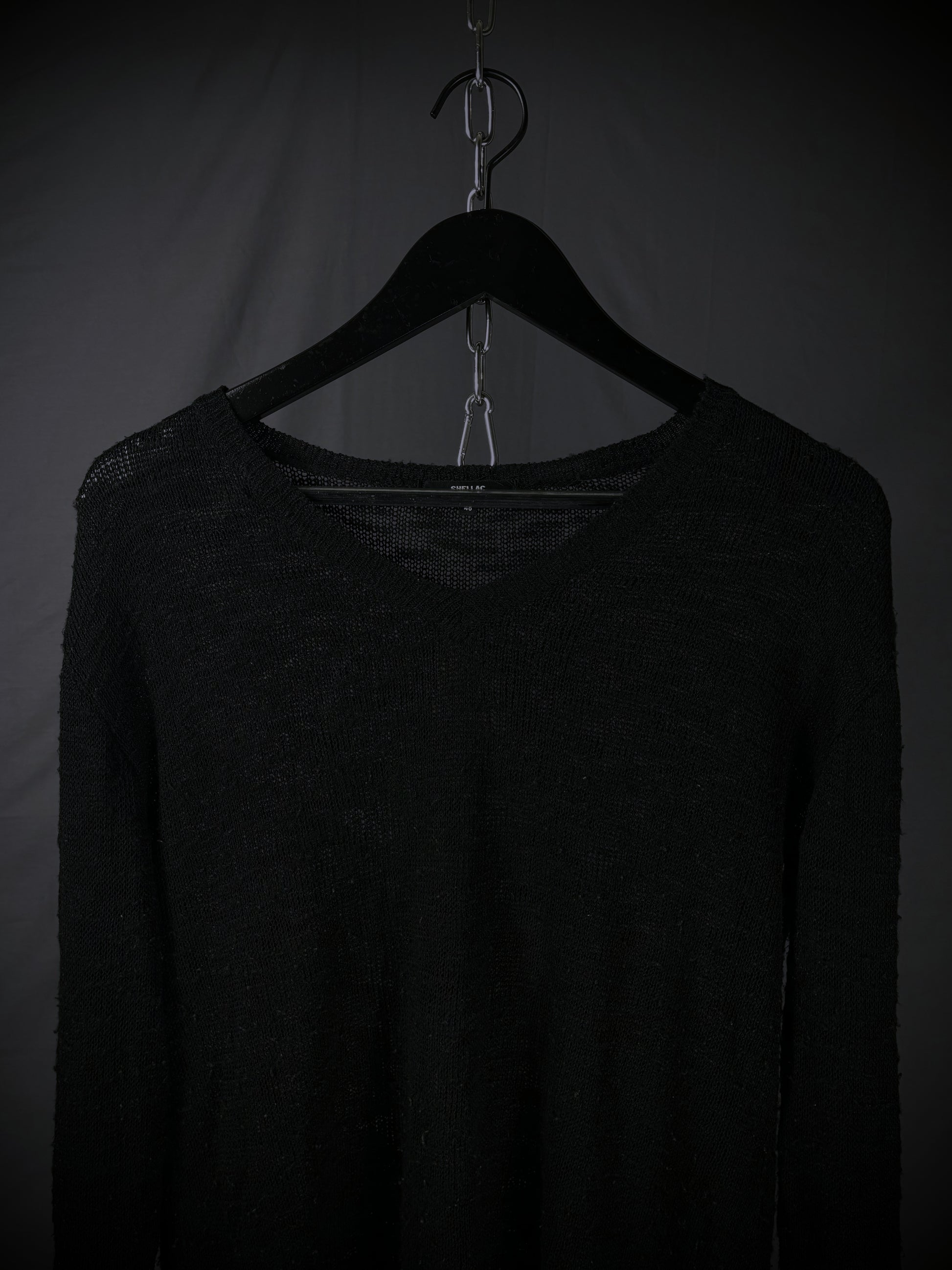 This sweater from the Japanese brand Shellac is made from a thin hemp/acrylic blend open-knit fabric, giving the garment a sheer look and a worn-in, textured feel. It features a simple V-neck silhouette, complemented by ribbed detailing along the collar and cuffs.