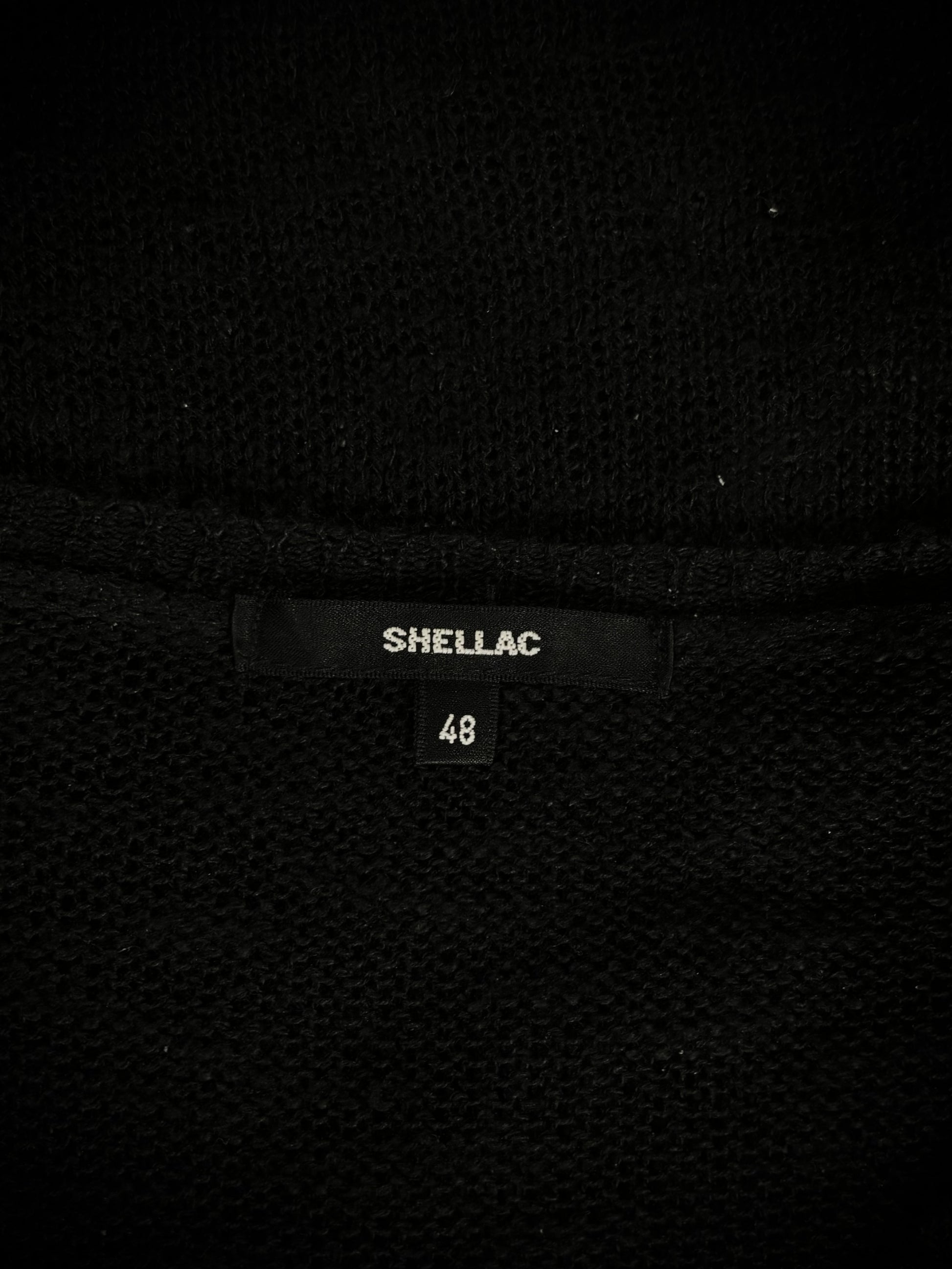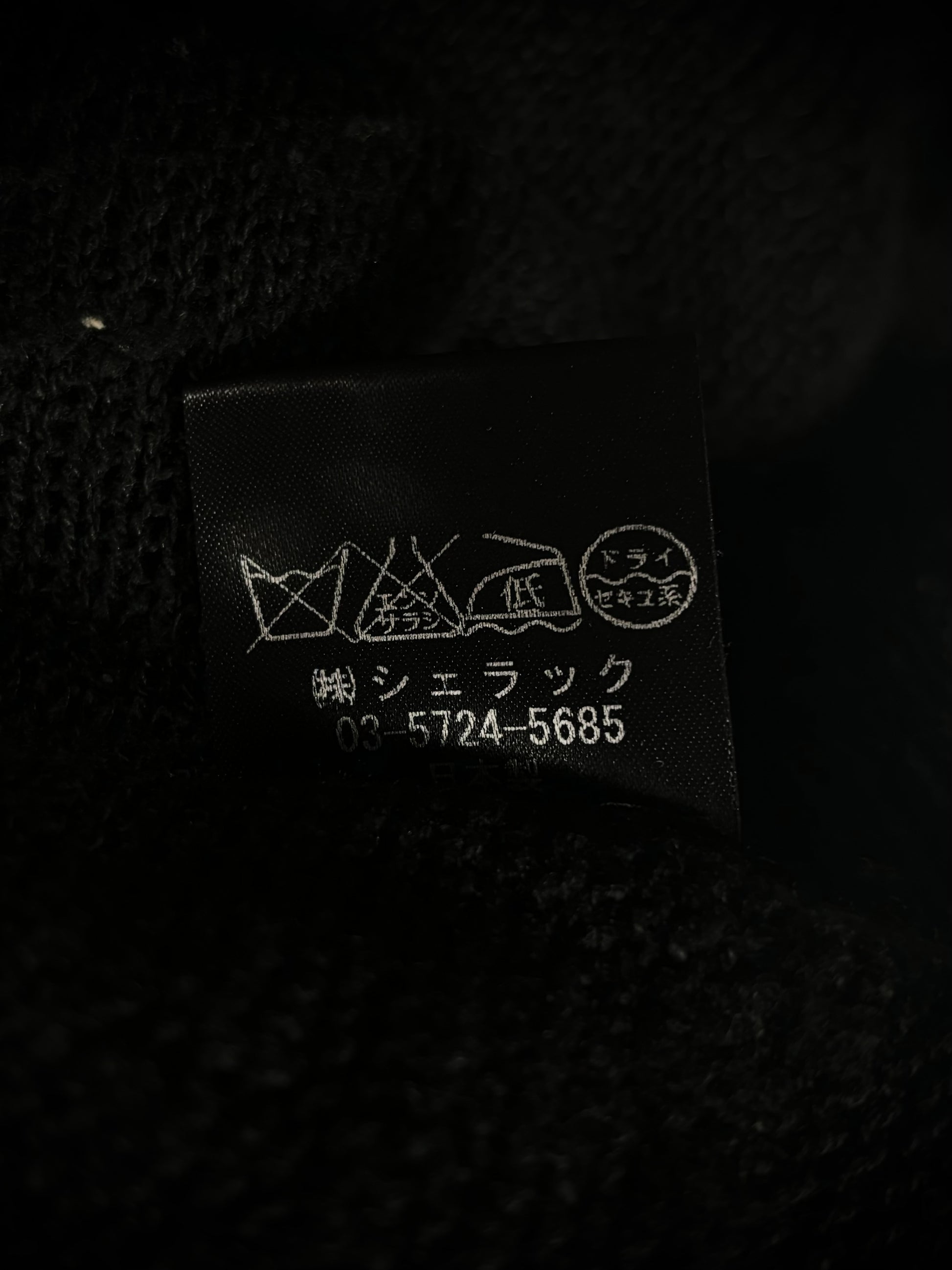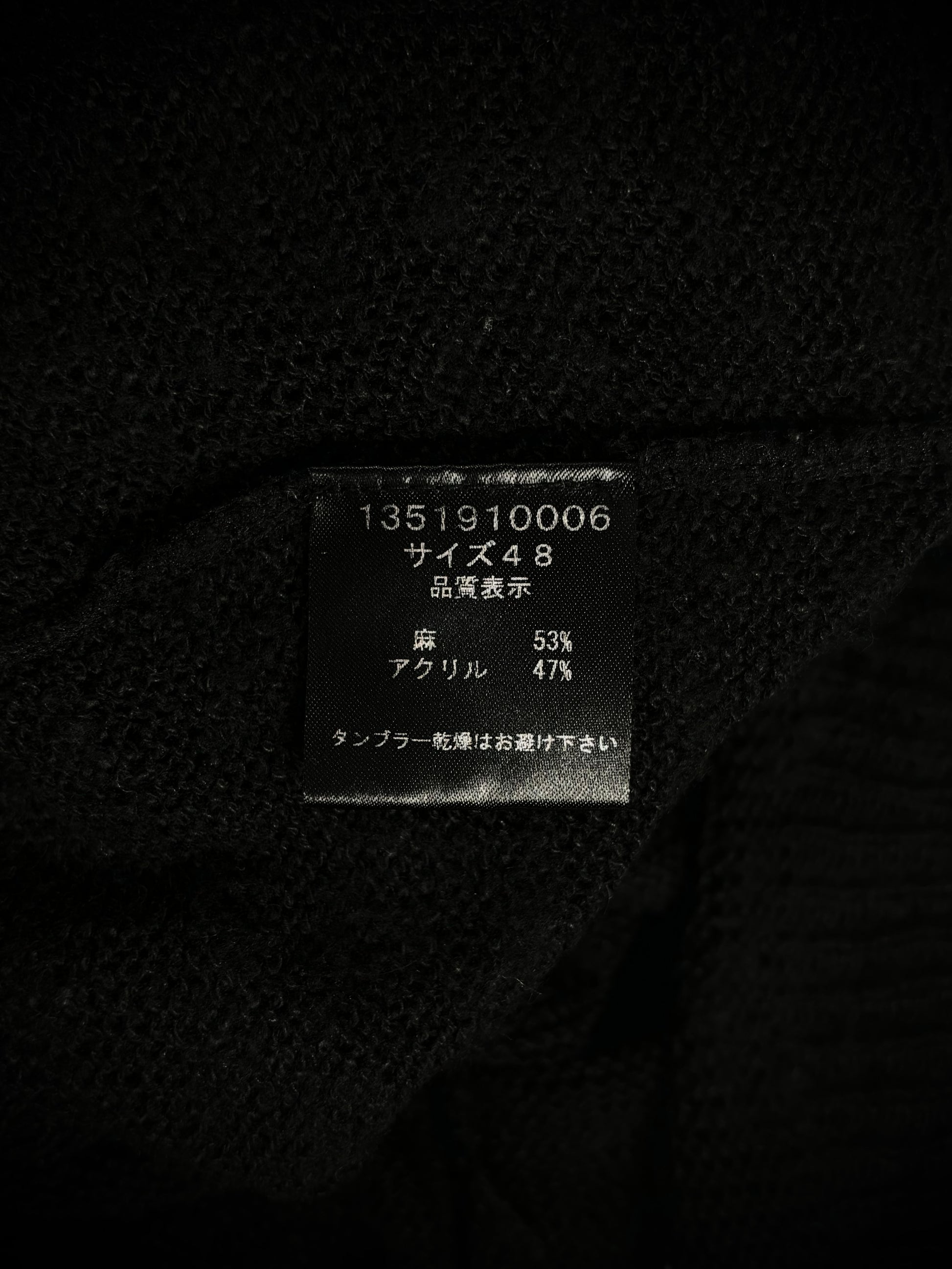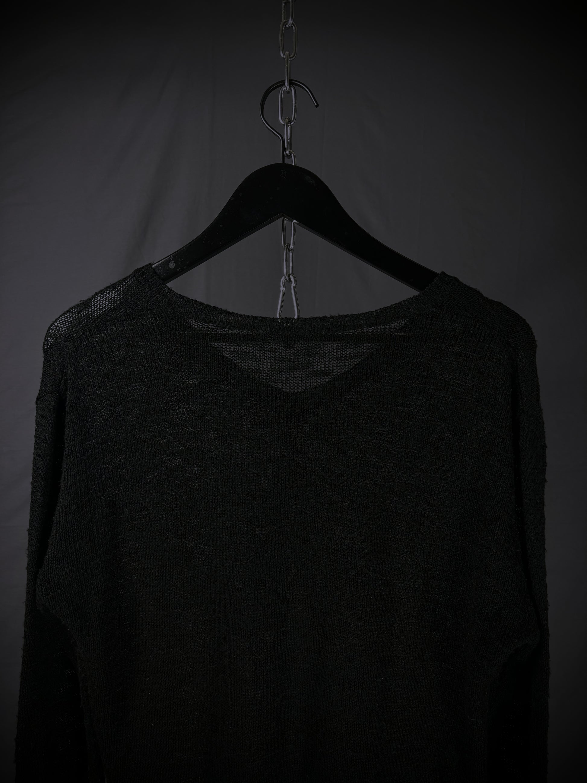 This sweater from the Japanese brand Shellac is made from a thin hemp/acrylic blend open-knit fabric, giving the garment a sheer look and a worn-in, textured feel. It features a simple V-neck silhouette, complemented by ribbed detailing along the collar and cuffs.