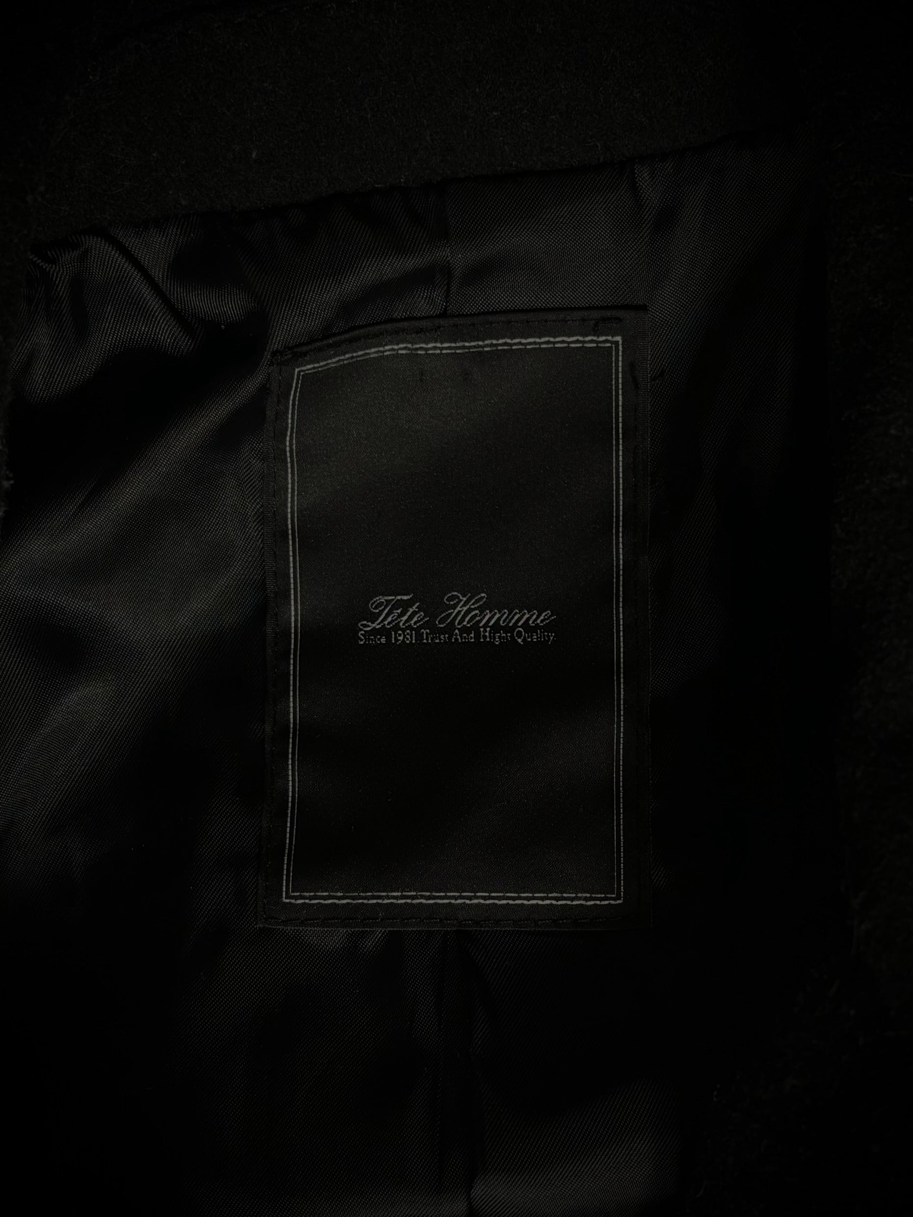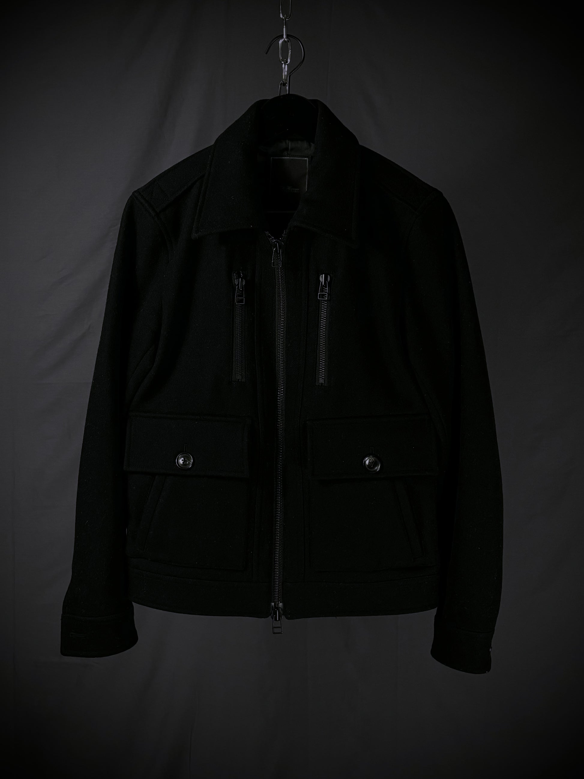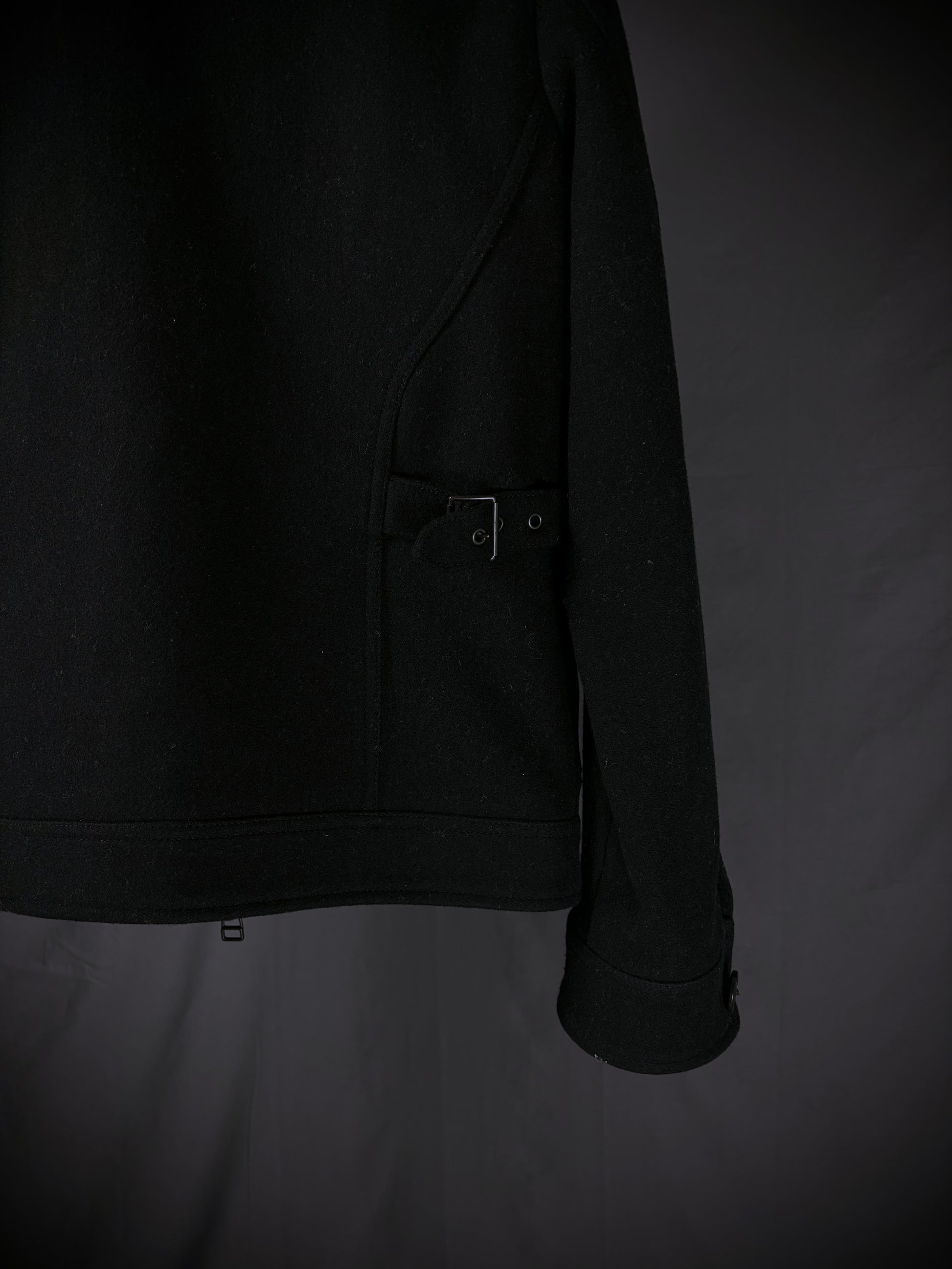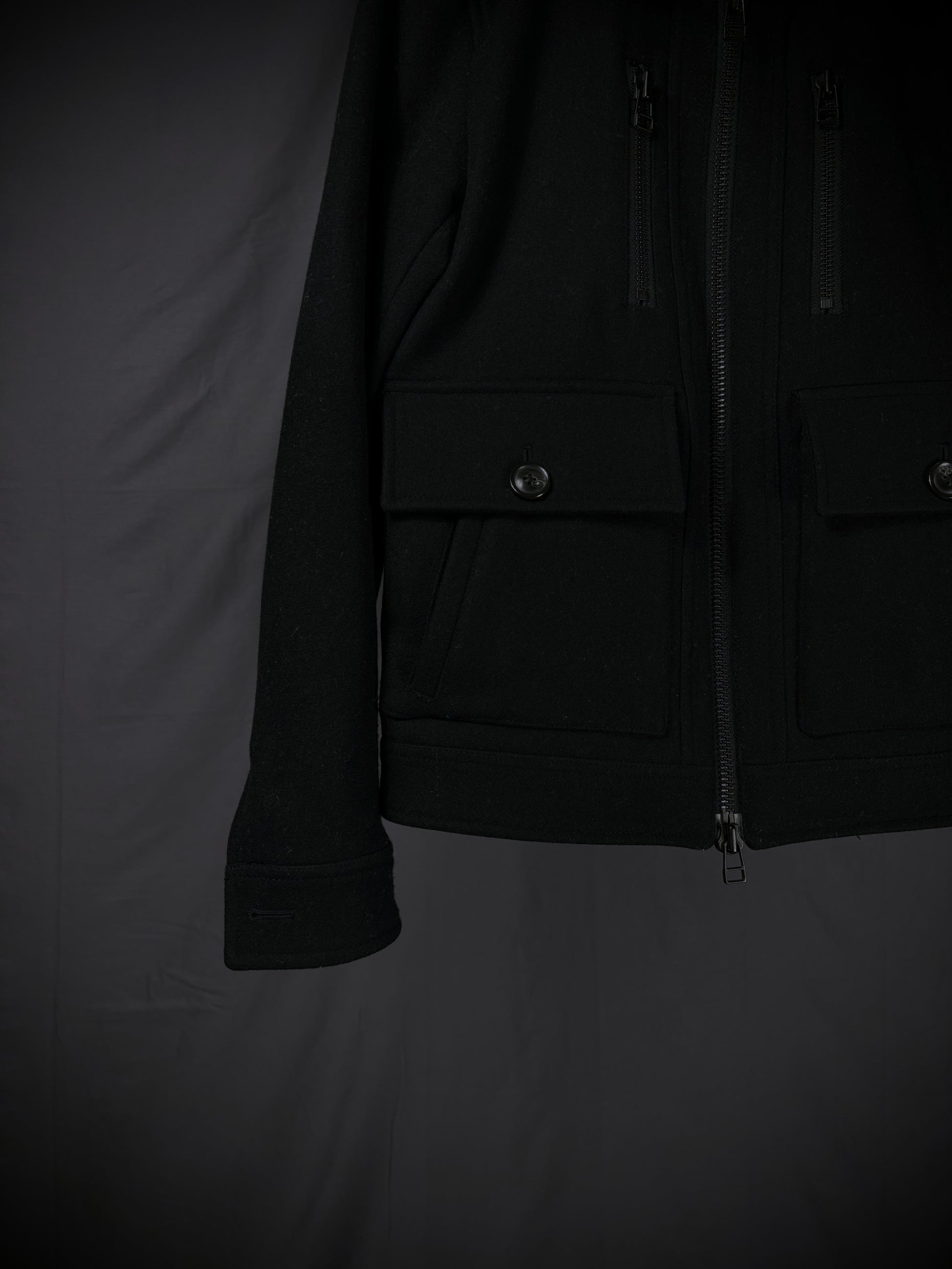 This jacket by the Japanese brand Tete Homme is crafted with a black wool outer and a fully lined polyester interior. It features a full zip front, vertical zippered chest pockets, lower buttoned flap pockets, and a structured collar, finished with two adjustable buckle straps at the back.