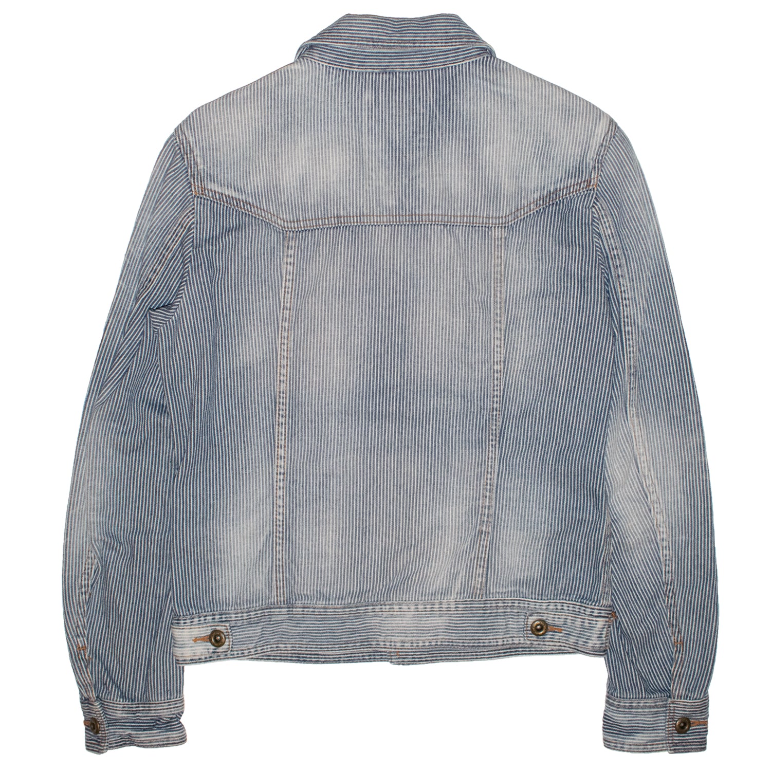 Here we have yet another stunning piece from Tete Homme. Like many of the garments from the Japanese label; this denim jacket is packed with details. To start off, the denim consists of coarse, twilled cotton known as “Hickory” – A distinctive striped fabric that is said to originate from the wives of railroad workers and is known to be durable, but breathable. This piece also boasts elements of Americana such as the bronze buttons which are stamped with stars and stripes. Lastly, we see instances of reconstruction such as a lone uneven chest pocket and the “XXX” motif which is established by using six hickory striped belt loops. This denim jacket by Tete Homme is eye-catching thanks to its unique details and can be worn during all seasons.