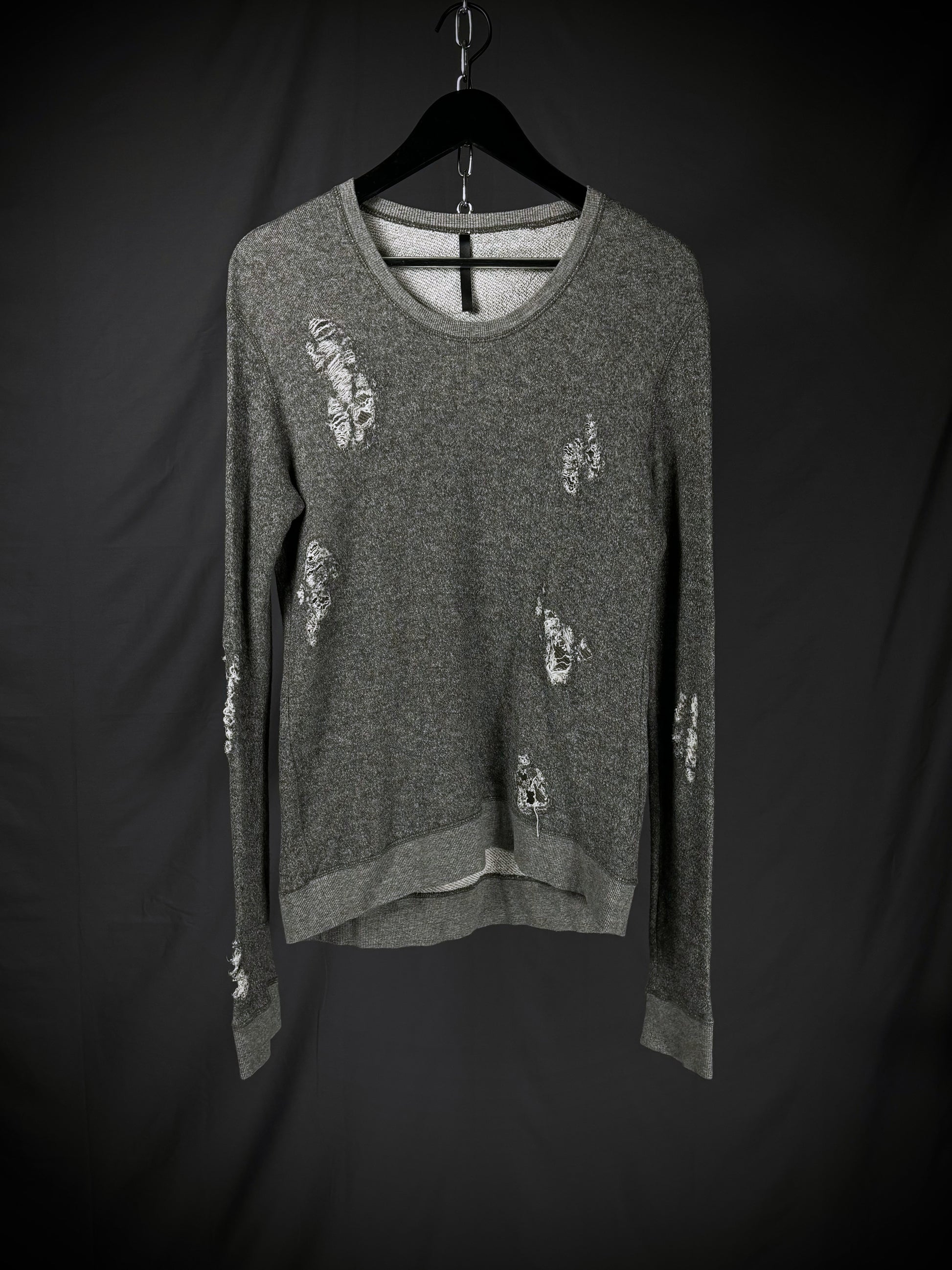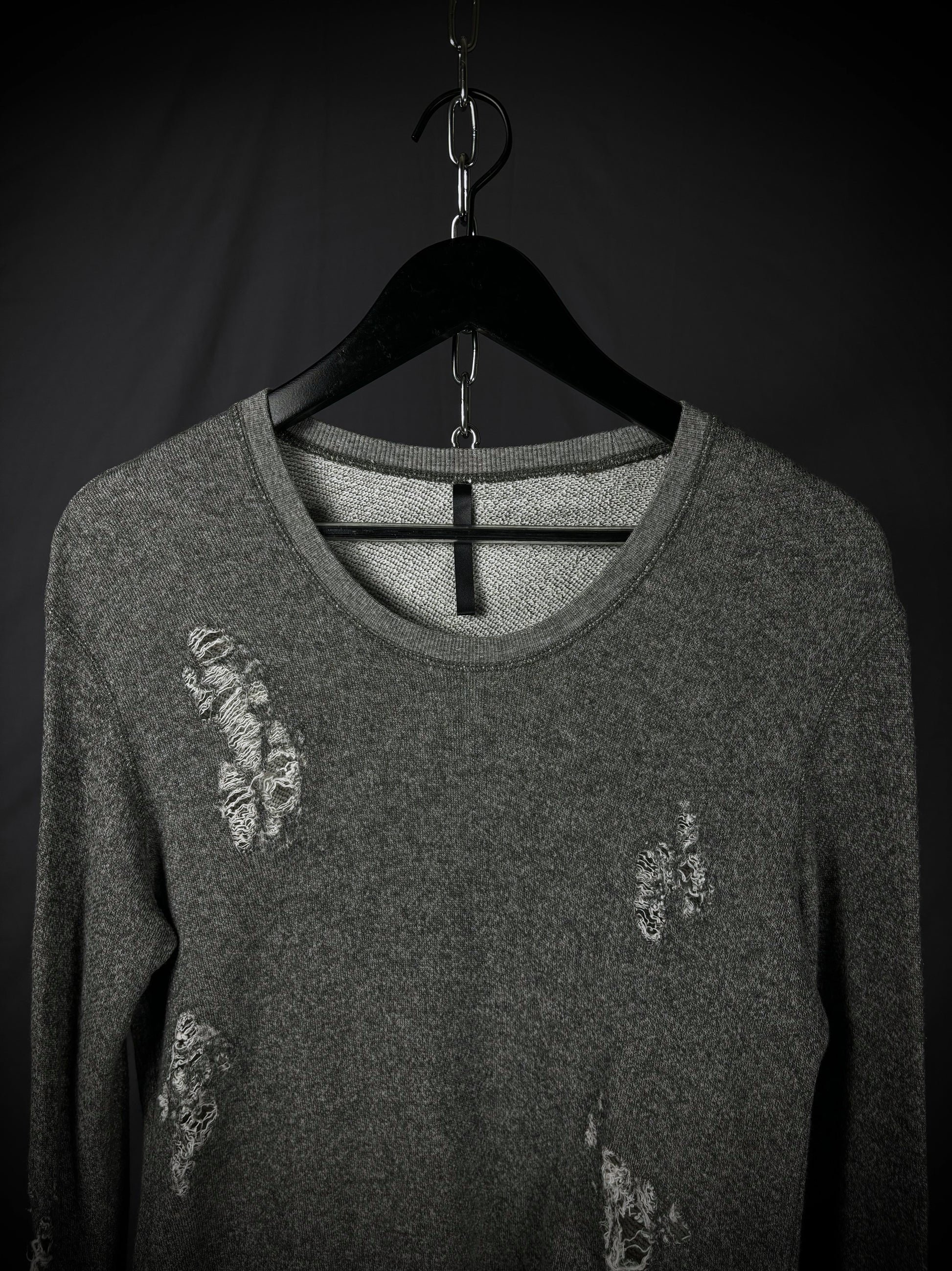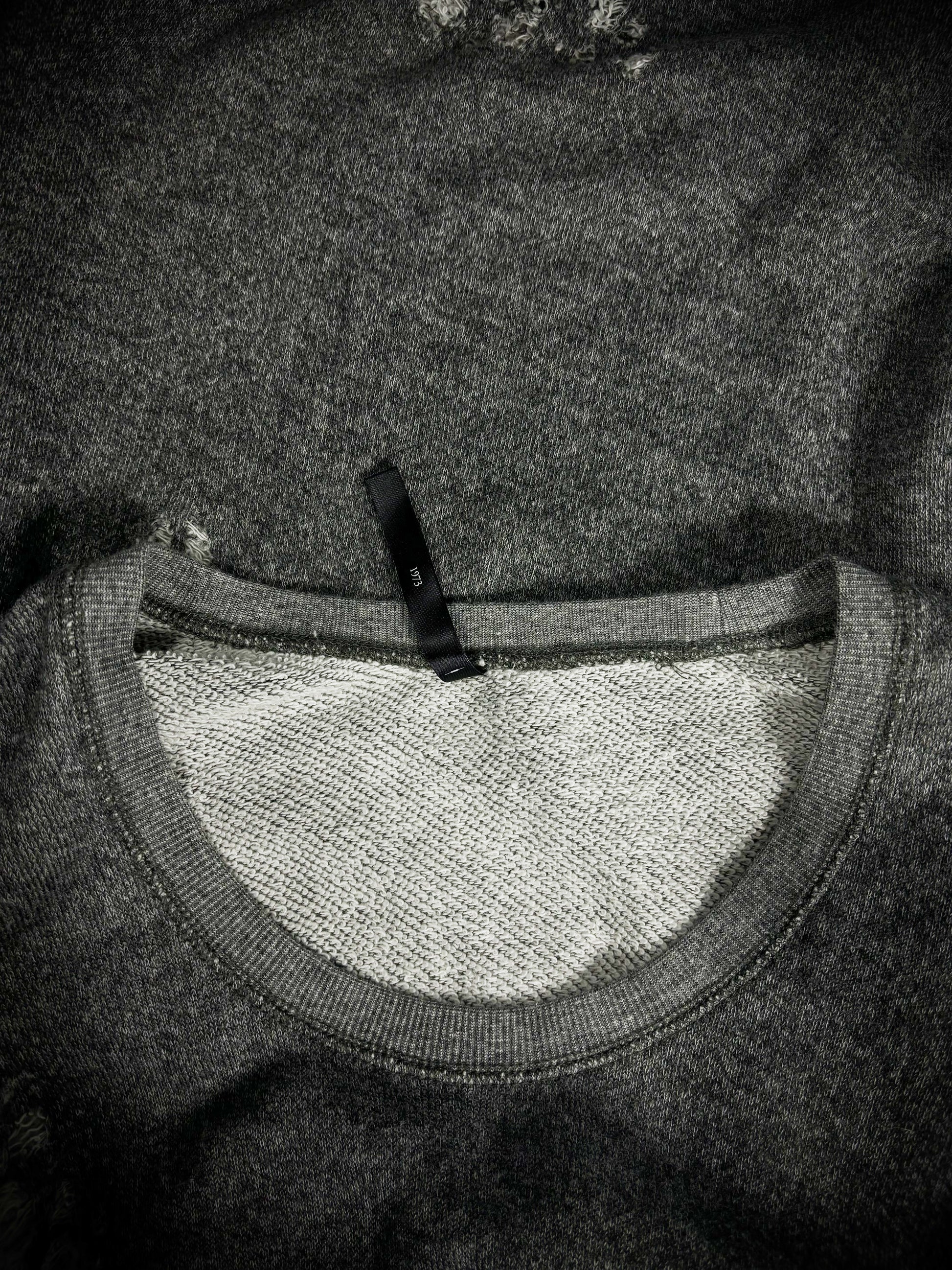 This gray sweatshirt by Thee Old Circus, designed by Urano Takahiro, is crafted from an ultra-soft cotton-rayon terry fabric. The slim-cut garment features aggressive distressed accents and shredded details throughout the body and sleeves. Finished with a simple crew neck and ribbed trims, it embodies the brand’s rugged, artisanal aesthetic.