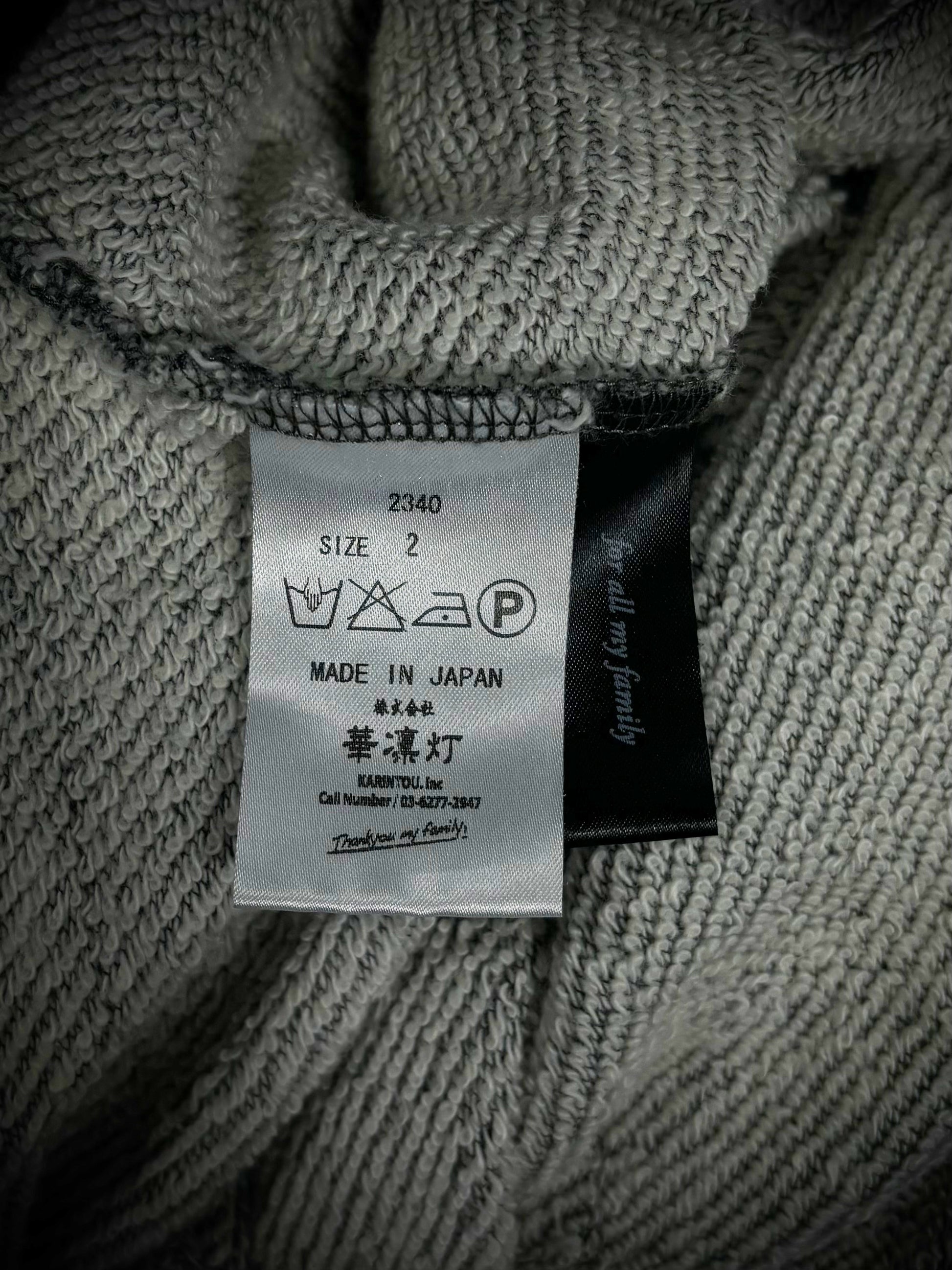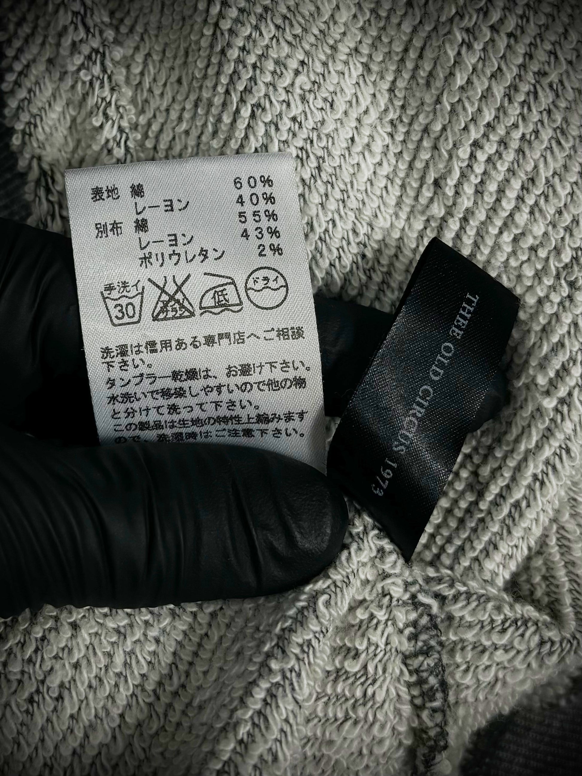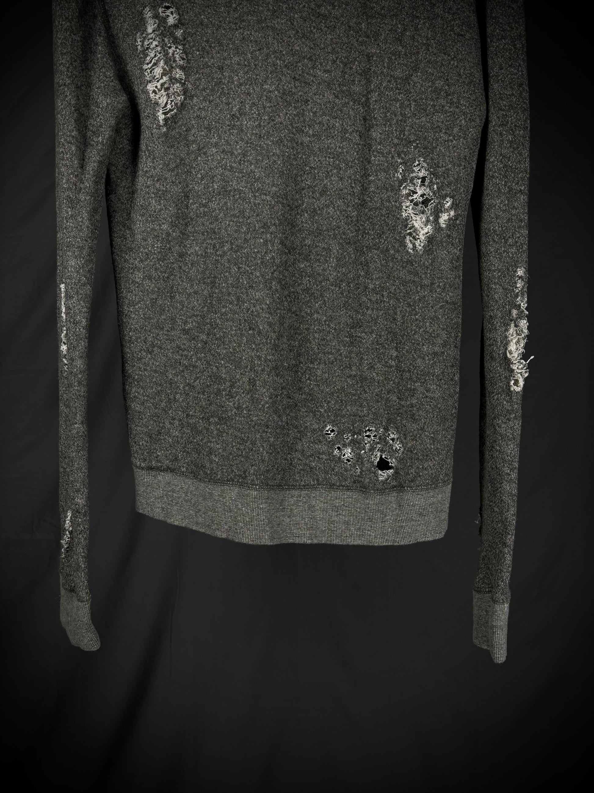 This gray sweatshirt by Thee Old Circus, designed by Urano Takahiro, is crafted from an ultra-soft cotton-rayon terry fabric. The slim-cut garment features aggressive distressed accents and shredded details throughout the body and sleeves. Finished with a simple crew neck and ribbed trims, it embodies the brand’s rugged, artisanal aesthetic.