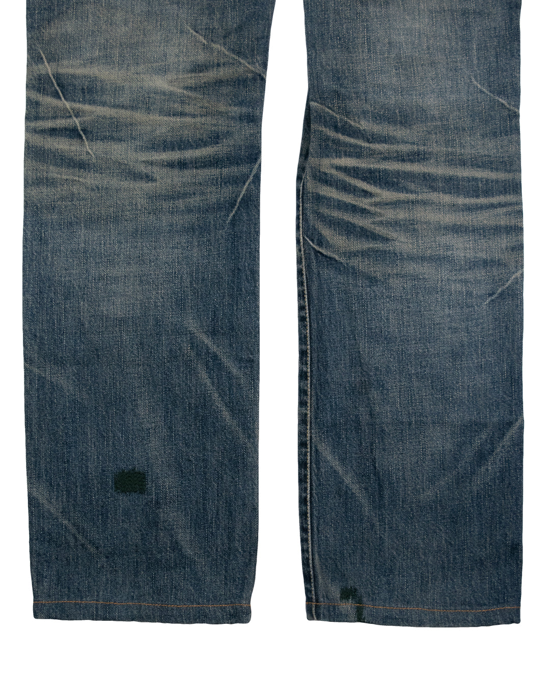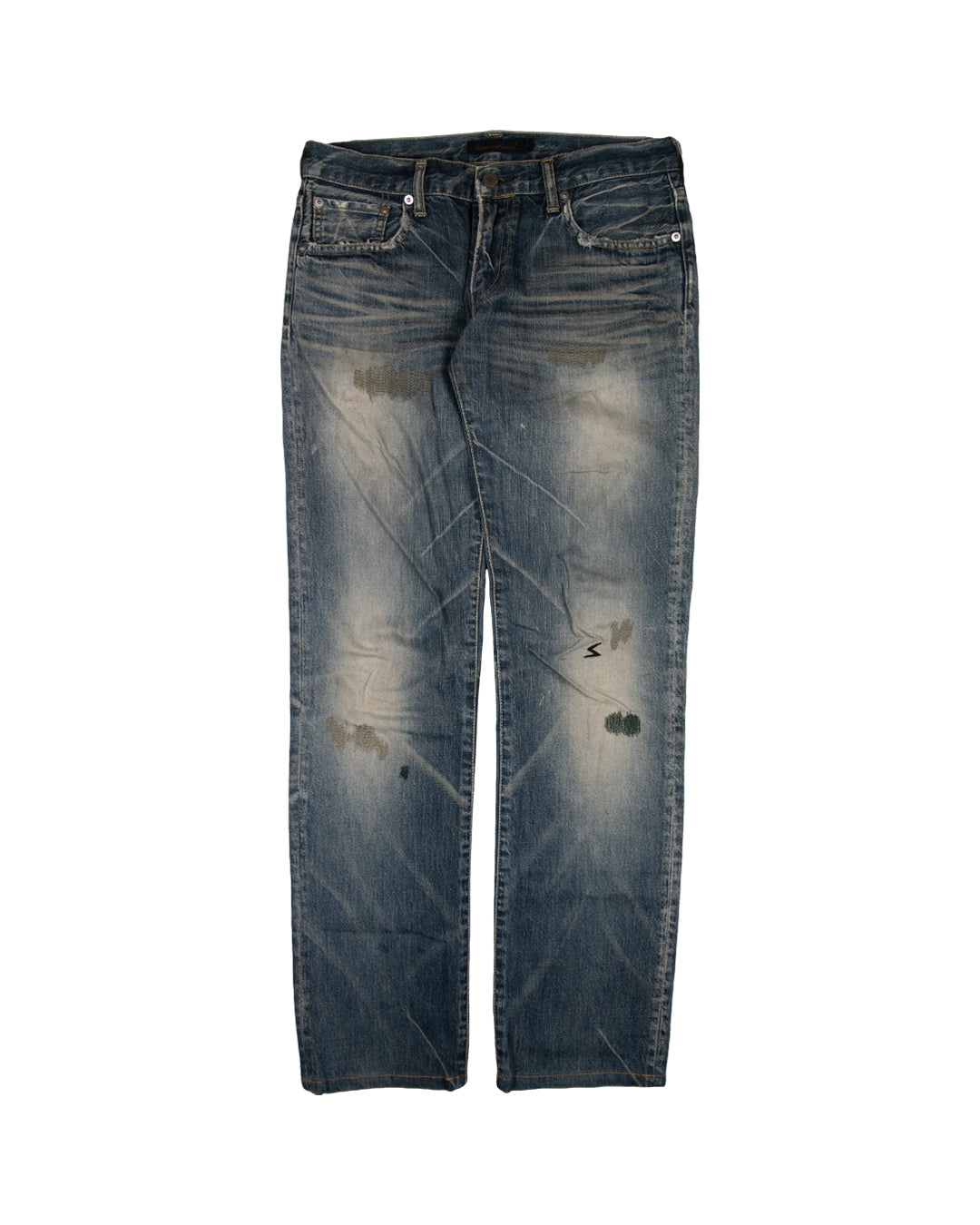 Here we have a pair of the highly-coveted “Apple Fang” denim from Undercover’s Autumn/Winter 2007 “Knit” ready-to-wear collection. This eye-catching pair of mid-wash denim features the notorious green/white guru apple motif with UC branding and a fang silhouette embroidered on both the exterior and interior of the back-right pocket. The incredible wash on this pair of denim is complimented by an array of subtle distressing’s, hand repaired stitching, and the infamous lightning bolt motif embroidered onto the left knee. This truly iconic pair of denim from Undercover has a timeless appeal backed by the creative mind of Jun Takahashi.