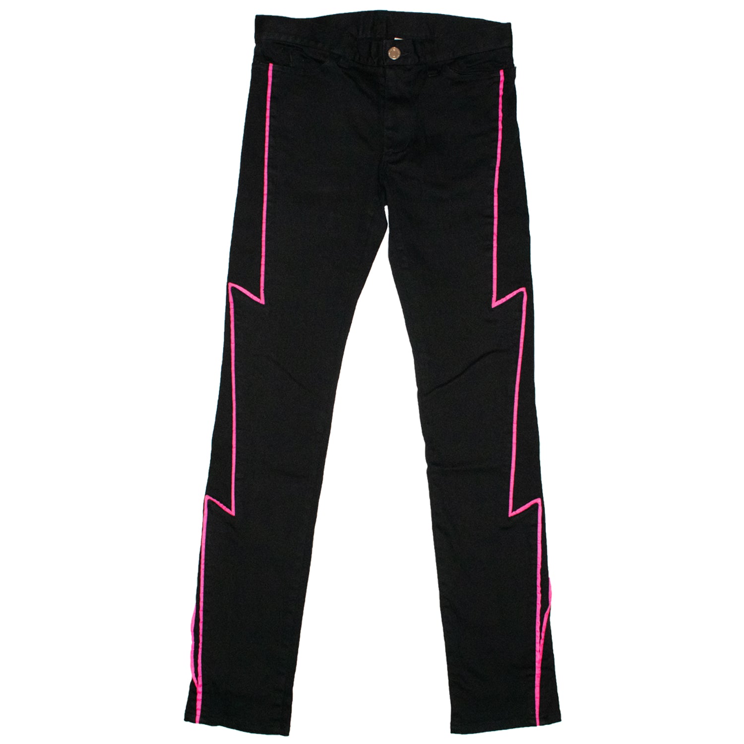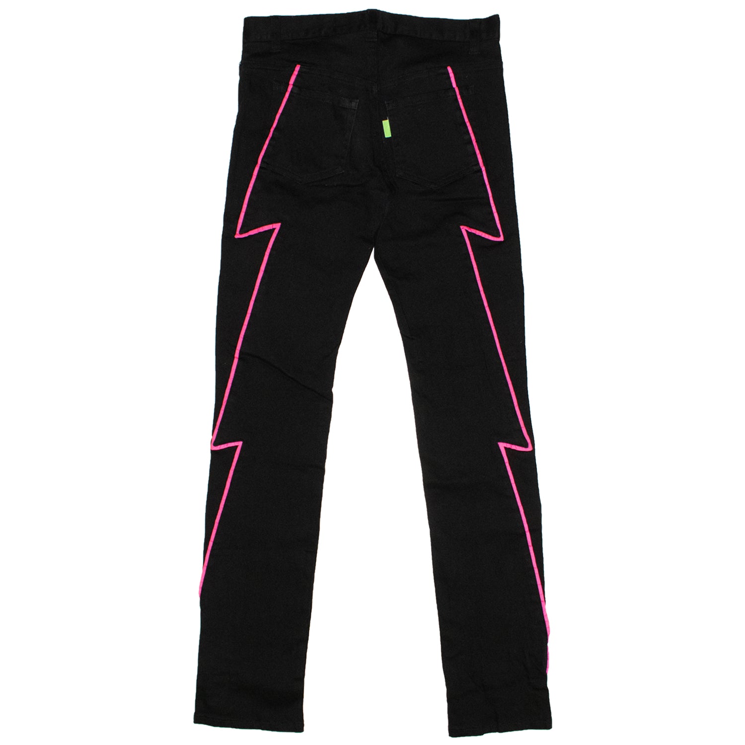Here we have an eye-catching pair of pants from Undercover’s SS01 “Chaotic Discord” era. This piece features piping detailing along the garment which creates the iconic lightning bolt motif around both legs, and a 5-pocket design that has the infamous neon green tag located on the back-right pocket.