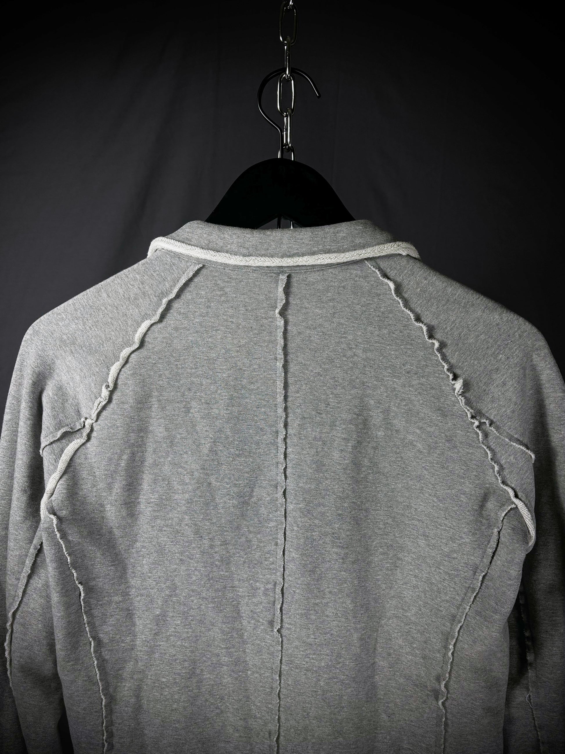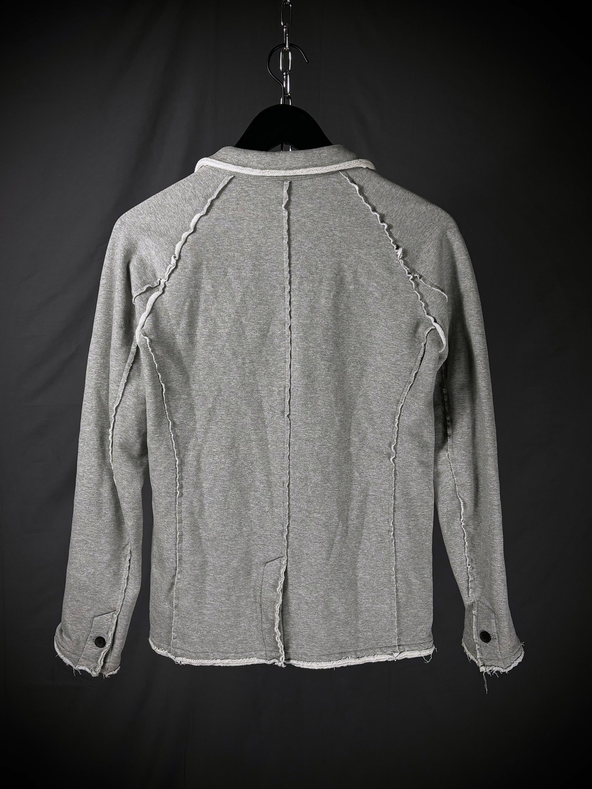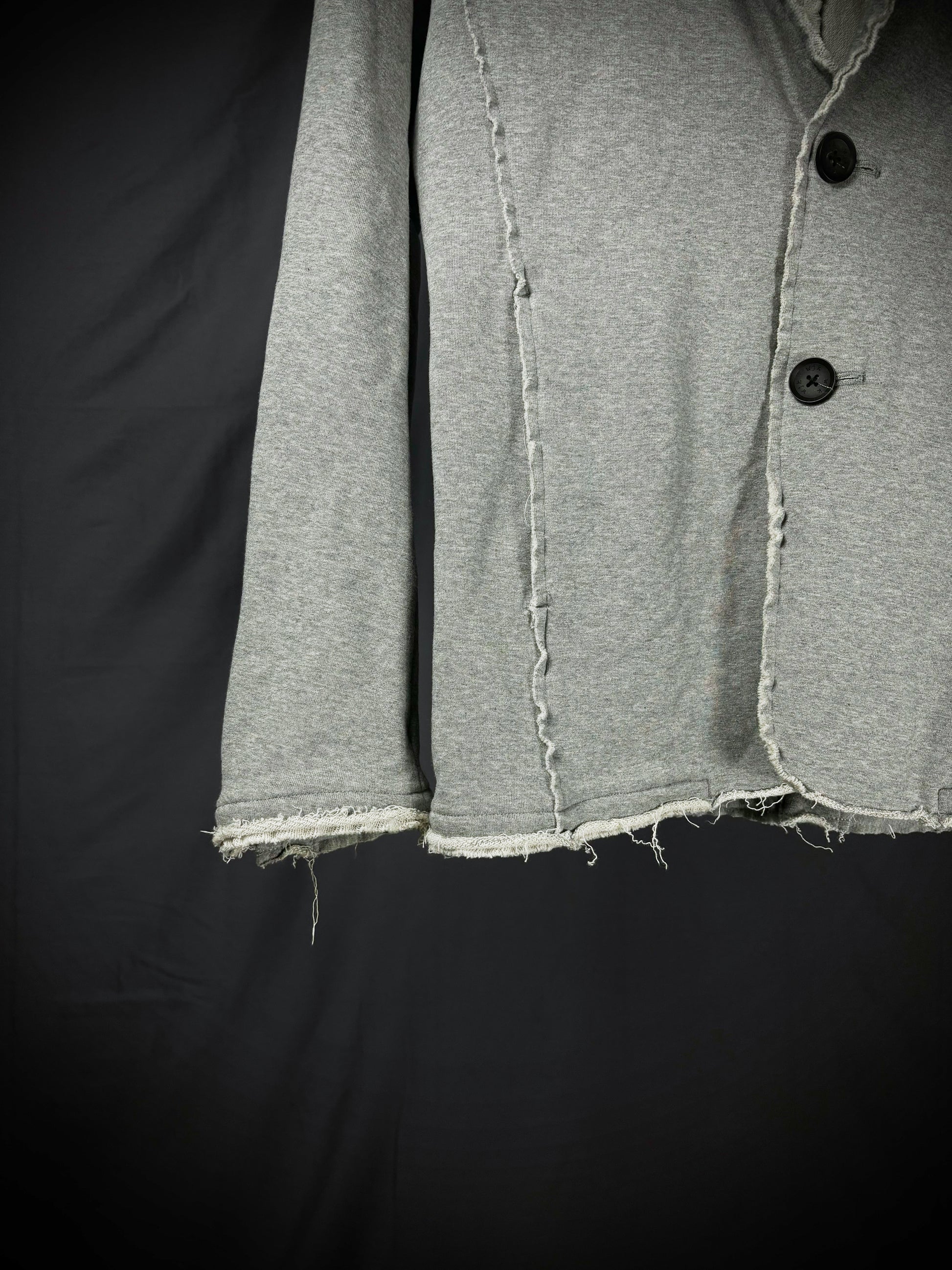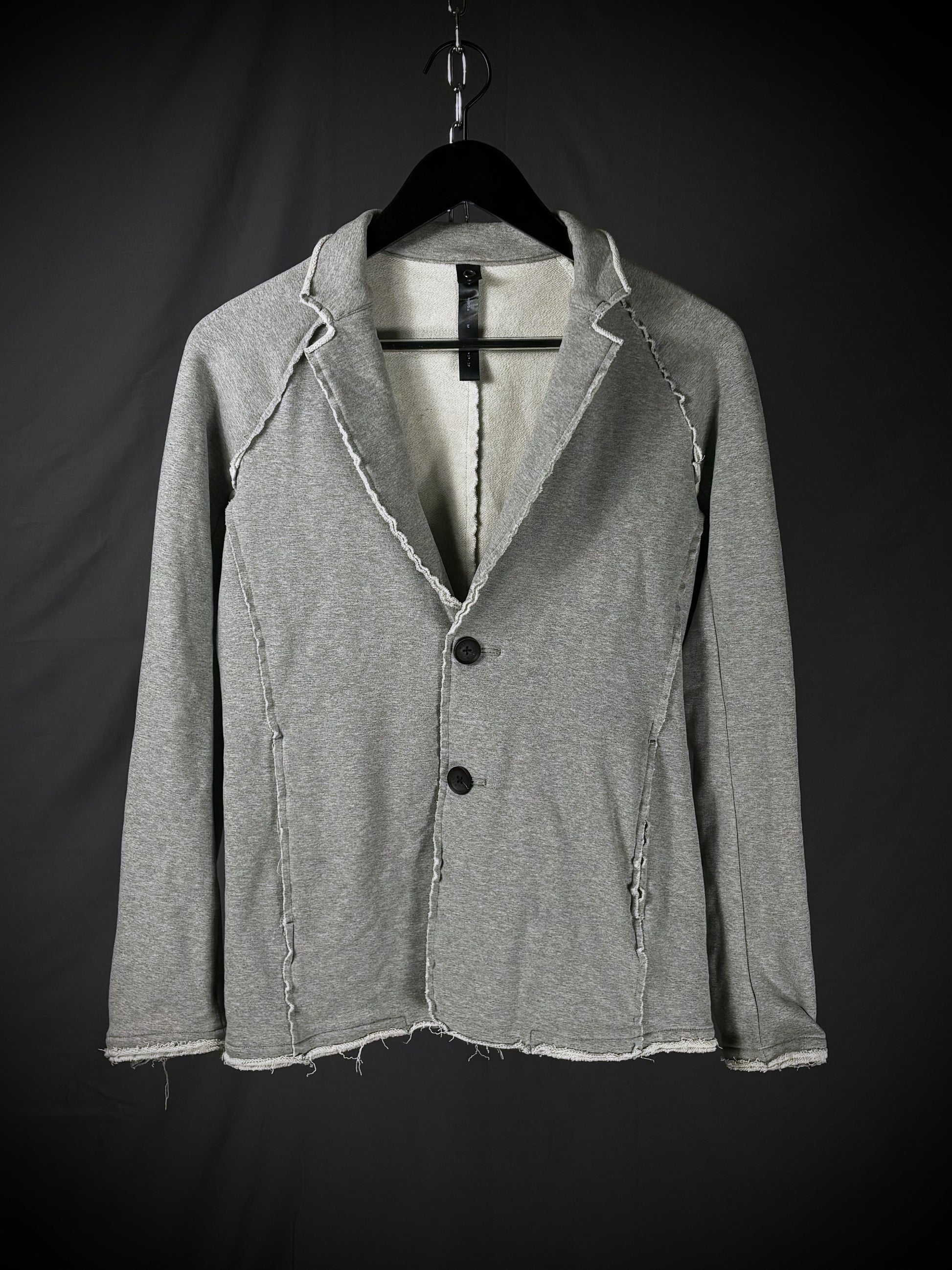 This blazer from the Japanese brand WJK is made from a soft terry fabric blend of cotton, nylon, and polyurethane. It features exposed seams throughout, creating natural distressed accents along the edges and panel lines. Designed with two front pockets, it is finished with button closures and a slim, timeless silhouette. Made in Japan.