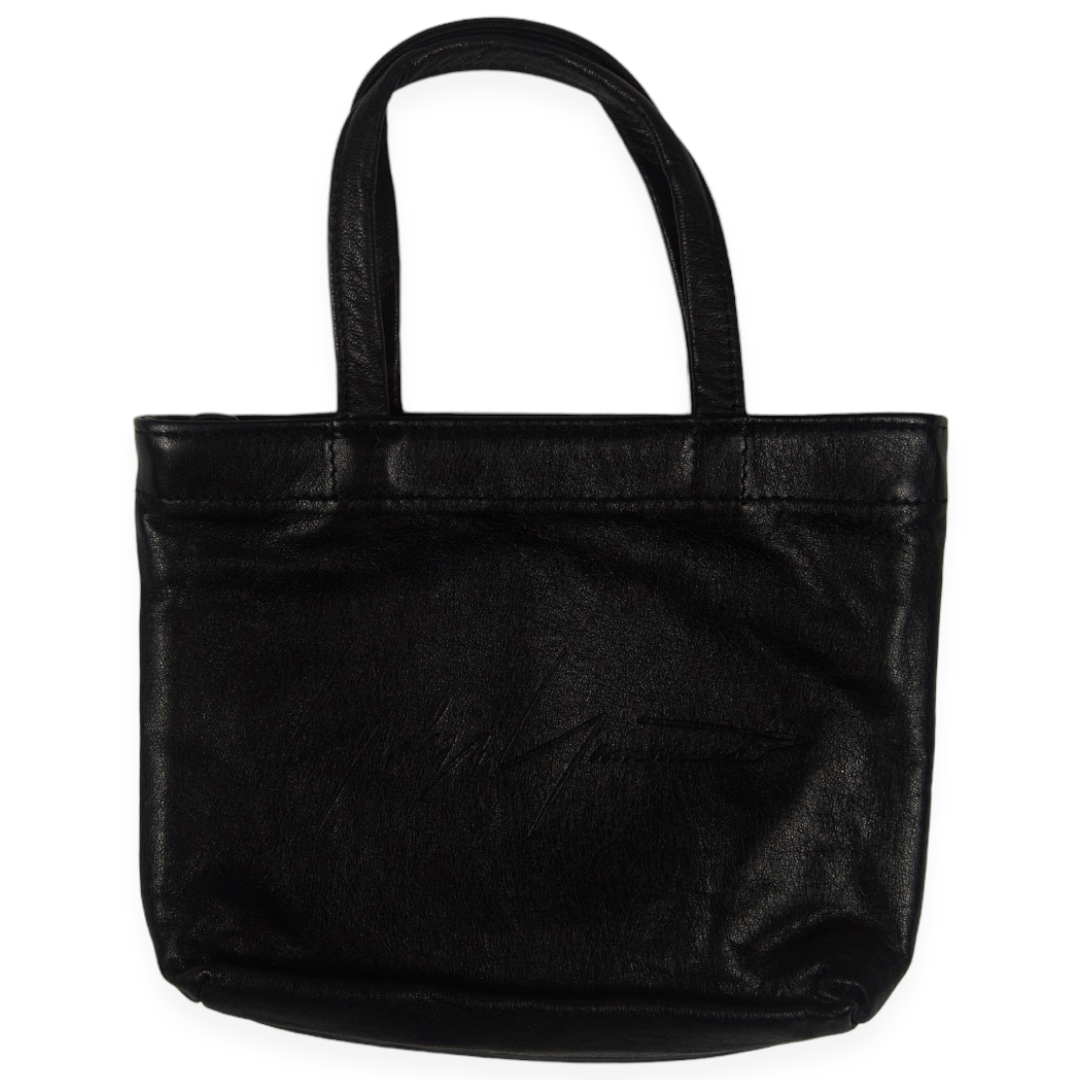 This handbag from the Japanese brand Yohji Yamamoto features a miniature design accompanied by a YKK zip closure, one large interior pocket, and a smooth leather outer stamped with Yohji Yamamoto’s iconic signature logo.